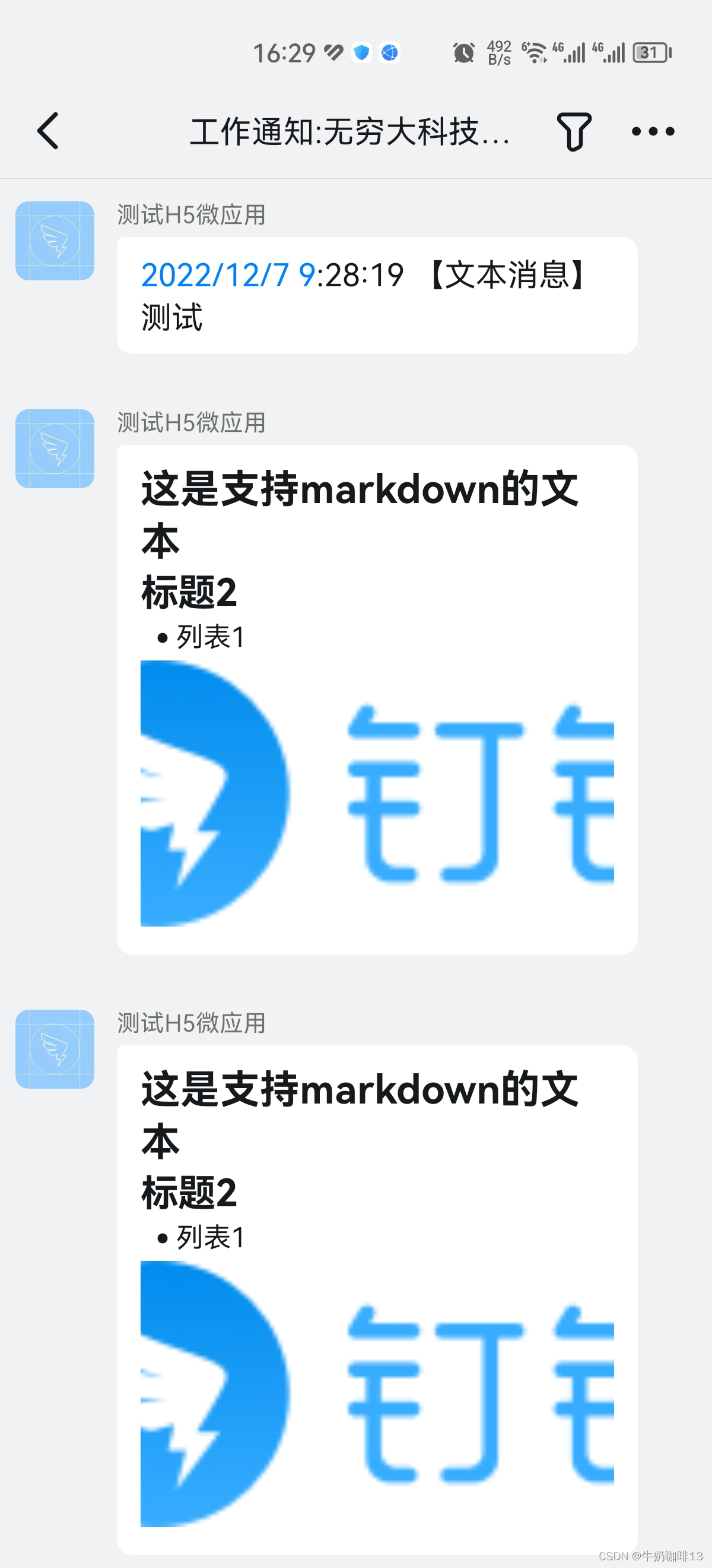 实现在钉钉的工作中心里面发送消息(比如发送【文本消息】、【markdown消息】等不同类型的内容),实现效果如下: