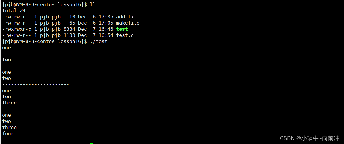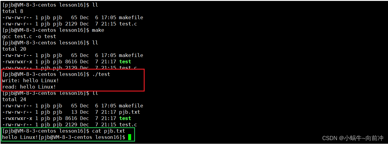 {//定义文件名char filename[] = "pjb.txt";//定义写入的数据char write_data[] = "hellow Linux!";//读取的数据char read_buf[64] = { 0 };//测试写入数据int fd = open(filename, O_RDWR | O_CREAT, O664);if (fd < 0){perror("open");return -1;}//写入内容int ret = write(fd, write_data, sizeof(write_data));if (ret < 0){perror("write");return -1;}else{printf("write: %s\n", write_data);}//关闭文件close(fd);//测试写入文件fd = open(filename, O_RDONLY);;if (fd < 0){perror("open");return -1;}//写入ret = read(fd, read_buf, sizeof(read_buf));if (ret < 0){perror("read");return -1;}else{printf("read: %s\n", read_buf);}close(fd);return 0;