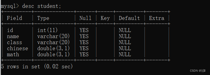 3、查看表结构desc 数据表名;