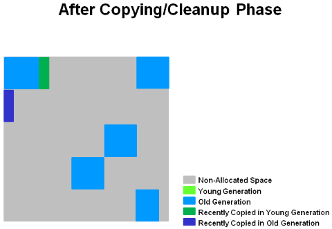 思路也很简单,将内存对半分,总是保留一块空着(上图中的右侧),将左侧存活的对象(浅灰色区域)复制到右侧,然后左侧全部清空。避免了内存碎片问题,但是内存浪费很严重,相当于只能使用50%的内存。