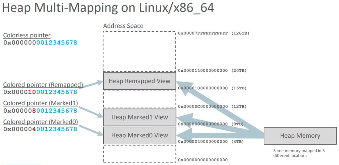 注:ZGC没有为止,没有实现分代机制,每次都是并发的对所有region进行回收,不象G1是增量回收,所以用不着RSets。不分代的带来的可能性能下降,会用下面马上提到的Colored Pointer && Load Barrier来优化。