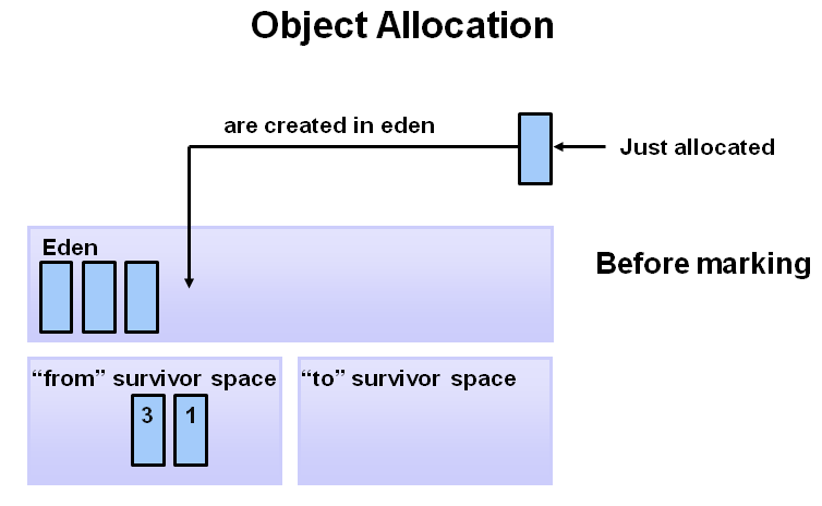 刚开始时,对象分配在eden区,s0(即:from)及s1(即:to)区,几乎是空着。