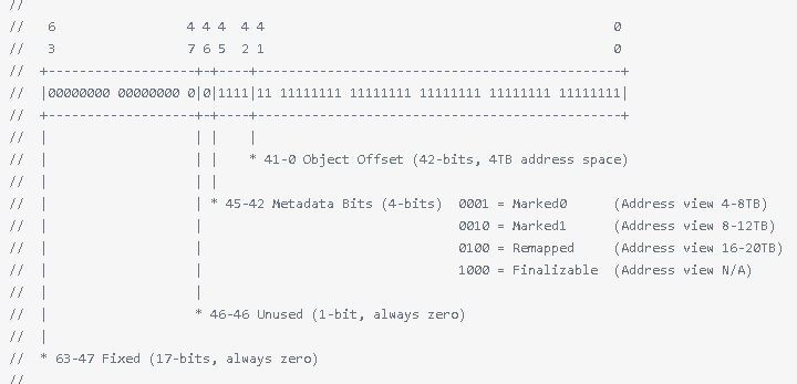 这里的指针类似java中的引用,意为对某块虚拟内存的引用。ZGC采用了64位指针(注:目前只支持linux 64位系统),将42-45这4个bit位置赋予了不同的含义,即所谓的颜色标志位,也换为指针的metadata。