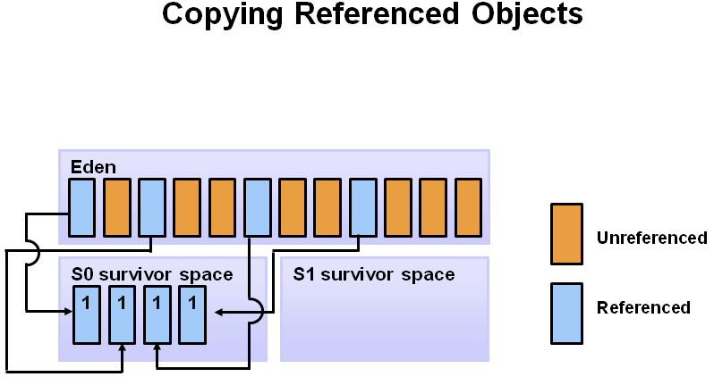 当eden区放不下时,就会发生minor GC(也被称为young GC),第1步当然是要先标识出不可达垃圾对象(即:下图中的黄色块),然后将可达对象,移动到s0区(即:4个淡蓝色的方块挪到s0区),然后将黄色的垃圾块清理掉,这一轮过后,eden区就成空的了。