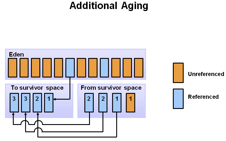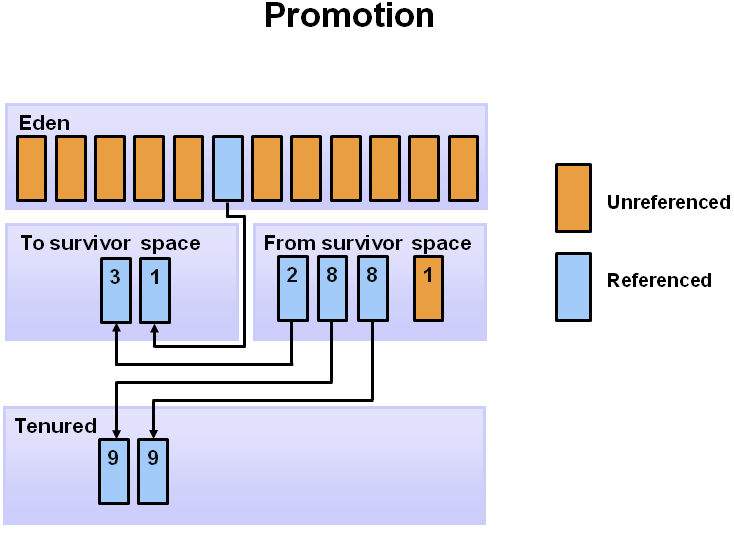 下图是晋升的主要过程:对象先分配在年青代,经过多次Young GC后,如果对象还活着,晋升到老年代。