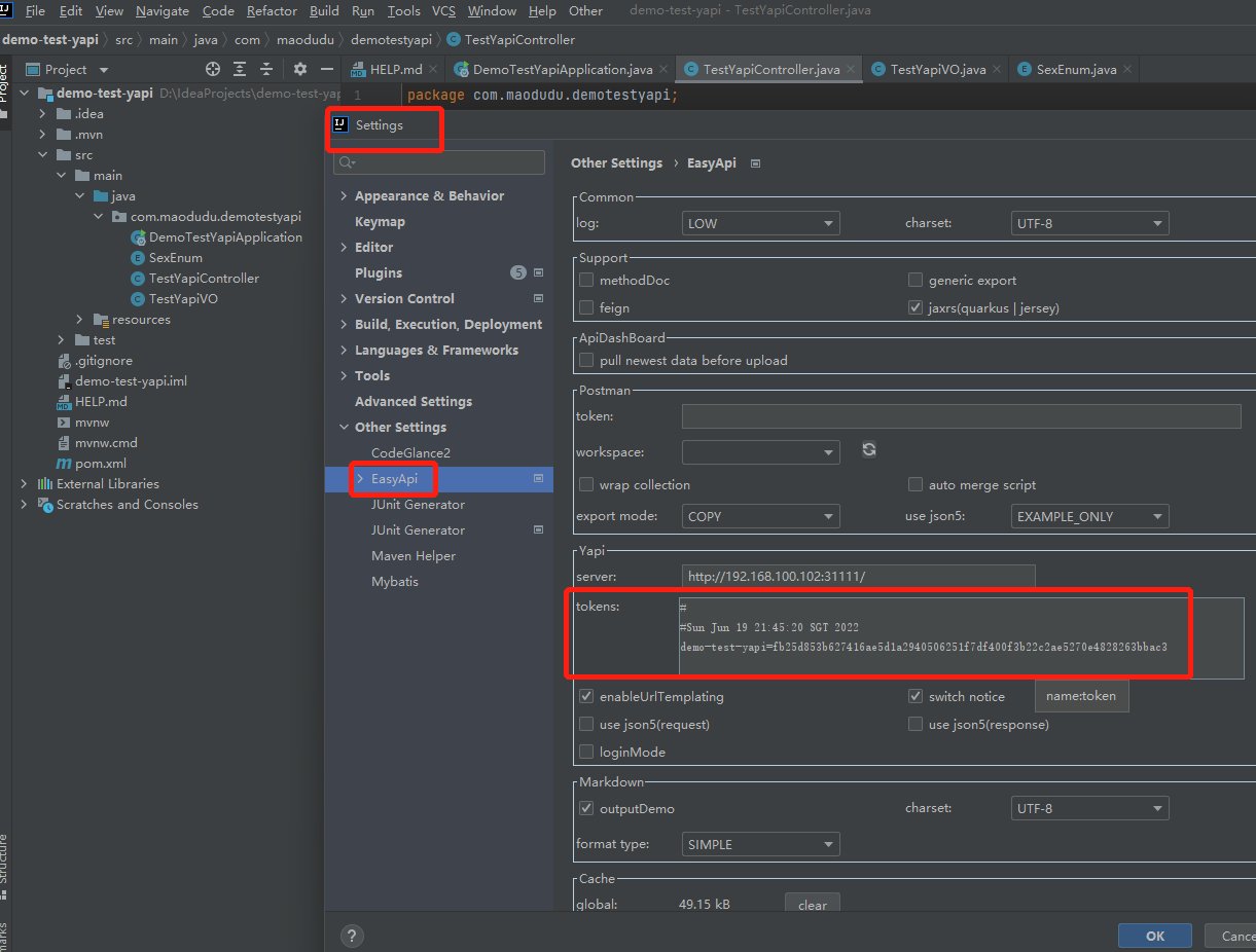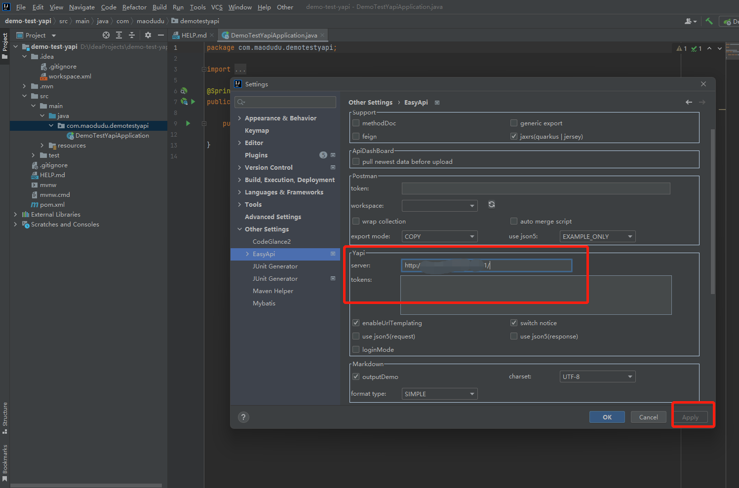 【第三步】: 打开Idea => Settings => Other Settings => EasyApi 设置,在 Yapi 这块区域中中的 server表单中输入我们公司或则个人自己的 Yapi 访问地址,比如:http://127.0.0.1:8677