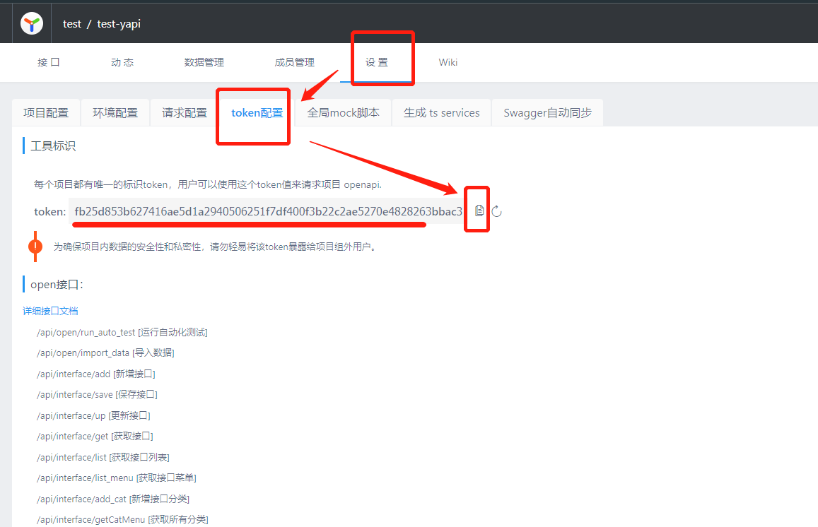 注意: 上图中的Token来源在 Yapi 服务界面【test】分组下的【test-yapi】项目设置中,【test】分组以及【test-yapi】项目都是我提前创建好的,各位可以在自己创建的项目中找到设置 => token 配置面板获取 Token