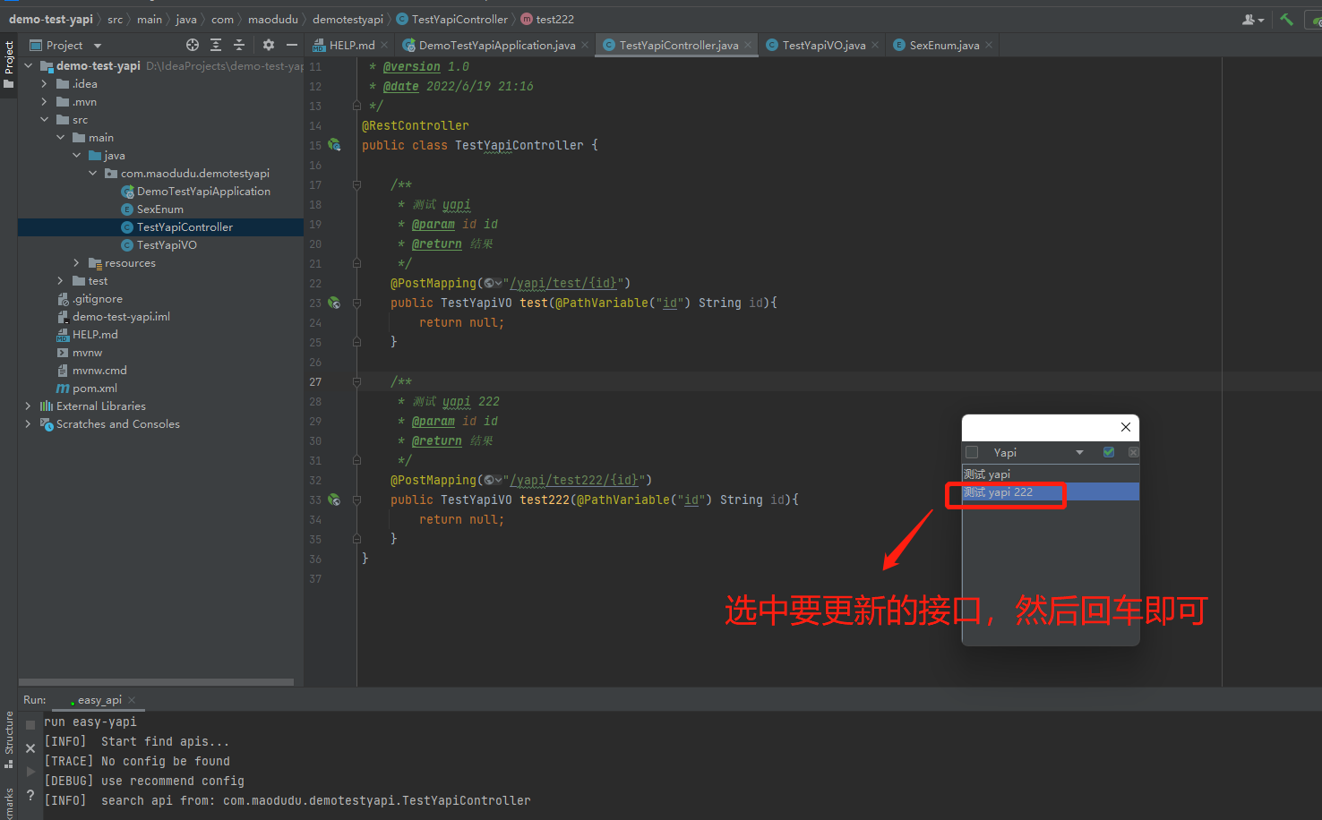 下面是对应的测试代码,通过代码对照这看生成的接口文档可以更加准确的了解Yapi额