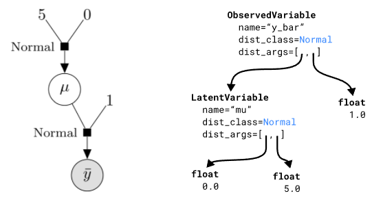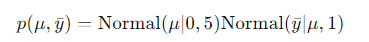 y_bar =ObservedVariable("y_bar", Normal, [mu, 1.0],observed=5.0)print(mu)
