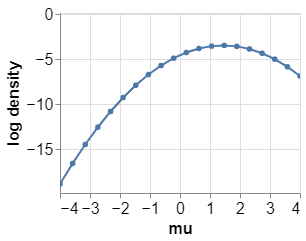 import numpy as npimport pandas as pdimport altair as altfrom smolppl import Normal, LatentVariable, ObservedVariable, evaluate_log_density#Define model#Weakly informative mean priormu =LatentVariable("mu",Normal, [0.0, 5.0])#Observation model. I make some observations y_1, y_2, ..., y_n and compute the#sample mean y_bar. It is given that the sample mean has standard deviation 1.y_bar =ObservedVariable("y_bar", Normal, [mu, 1.0],observed=1.5)#Grid approximation for the posterior#Since the prior has mean 0, and the observations have some uncertainty, I#expect the mode to be a bit smaller than 1.5. Something like 1.4grid =np.linspace(-4, 4, 20)evaluations = [evaluate_log_density(y_bar, {"mu": mu}) for mu in grid]#Plottingdata =pd.DataFrame({"grid":grid, "evaluations": evaluations})chart =alt.Chart(data).mark_line(point=True).encode( x=alt.X('grid', axis=alt.Axis(title="mu")), y=alt.Y('evaluations', axis=alt.Axis(title="logdensity"))).interactive().configure_axis( labelFontSize=16, titleFontSize=16)chart