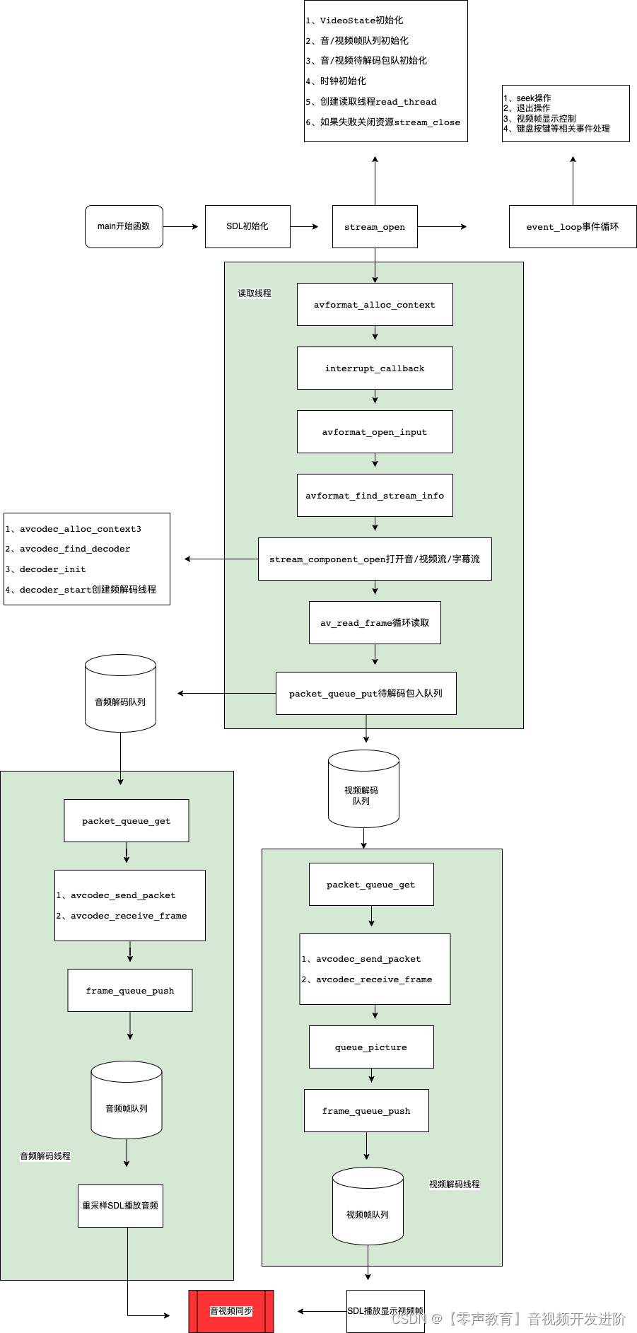 在前面我们介绍了ffplay的总体架构和一些关键的数据结构。今天我们还是从这张图开始,主要介绍ffplay的读取线程部分。