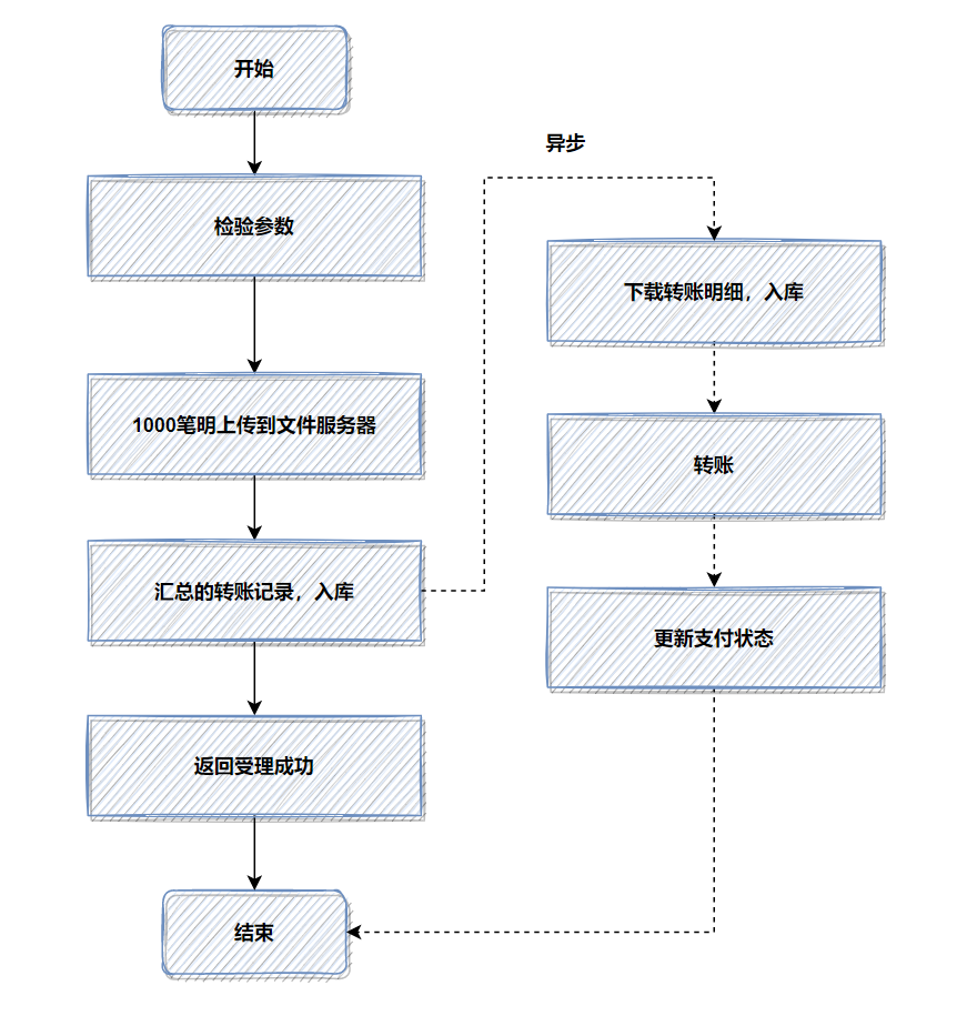 记得当时压测的时候,高并发情况,这1000笔明细入库,耗时都比较大。所以我转换了一下思路,把批量的明细转账记录保存的文件服务器,然后记录一笔转账总记录到数据库即可。接着异步再把明细下载下来,进行转账和明细入库。最后优化后,性能提升了十几倍。