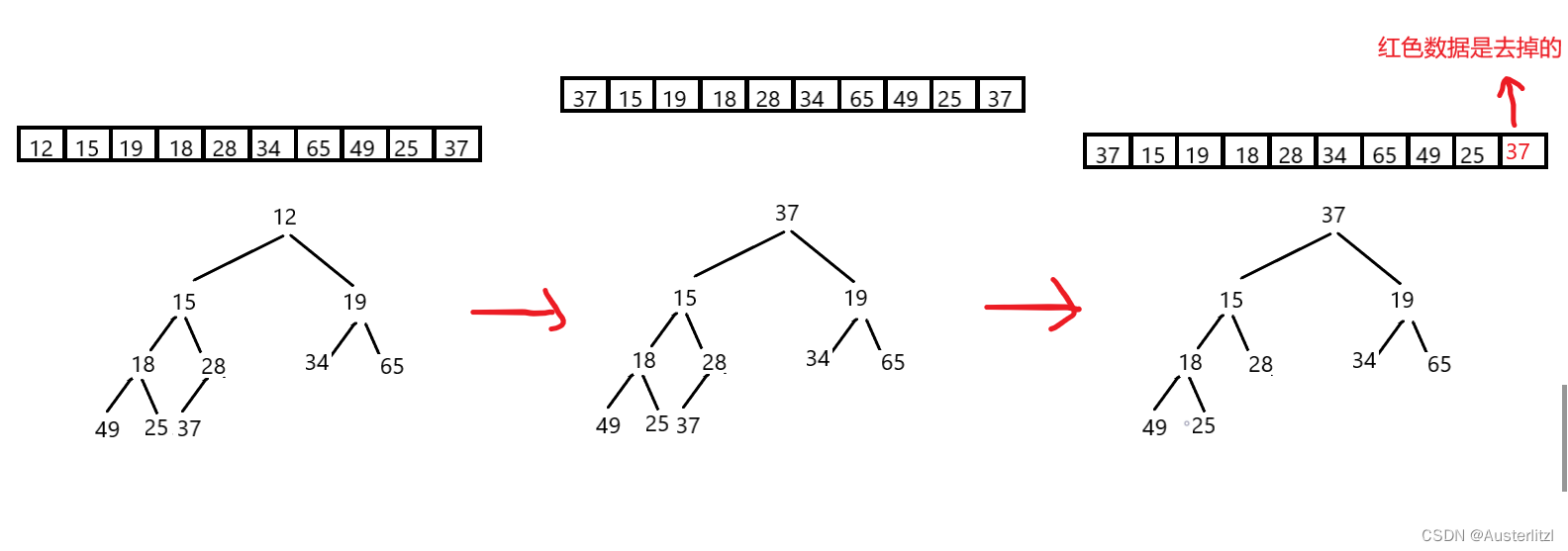 此时,我们可以参考堆操作里面的删除堆顶元素:把堆尾元素拷贝到堆顶,然后去除堆尾元素,进行向下调整,就能把当前堆的最小数据找出来。如下,先把37拷贝到堆顶,然后去掉堆尾的37,再以此从堆顶进行向下调整。