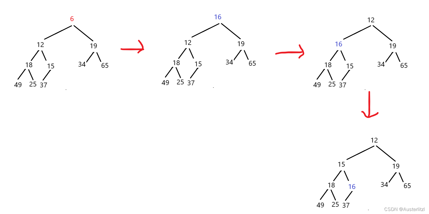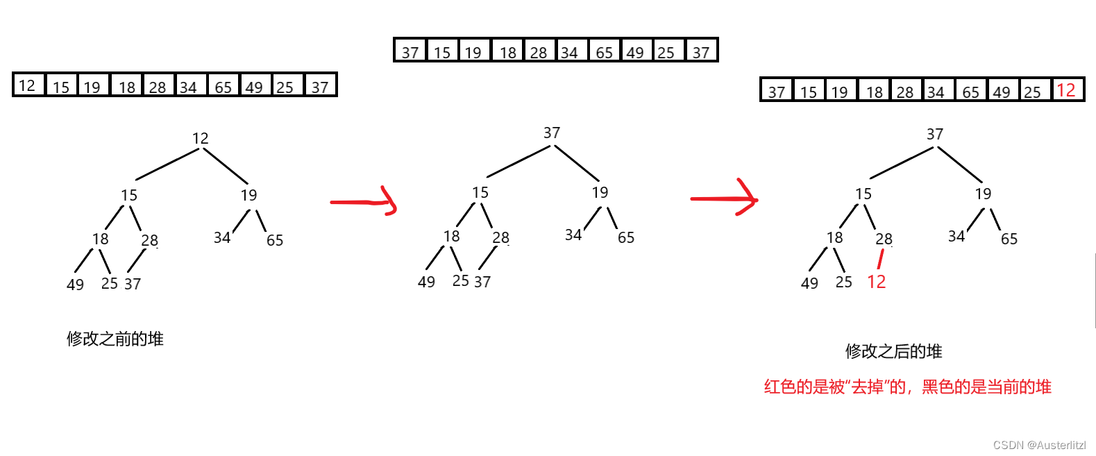 如下,把修改之前的堆顶元素,放到了被“去掉”的那块空间。下面最右边的那个堆,黑色的才是当前堆,红色是去掉的(画出来只是便于理解)。然后对当前堆(黑色的)进行向下调整,堆顶元素就是当前堆最小的,然后把堆顶元素和当前堆尾元素交换(黑色的)。