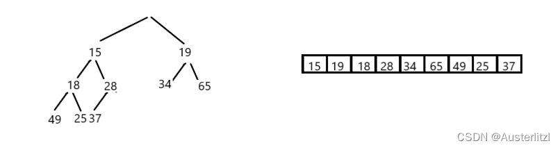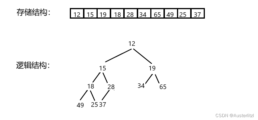 一个堆,只能明确其堆顶元素是最大还是最小,下面的孩子节点数据,根据其实际存储结构来看,未必是有序的。比如下图,是一个小堆,在实际存储结构上,也只能保证其首元素是最小的,后面的那些元素并不是有序的。所以,堆排序就是要把实际存储结构变成有序。