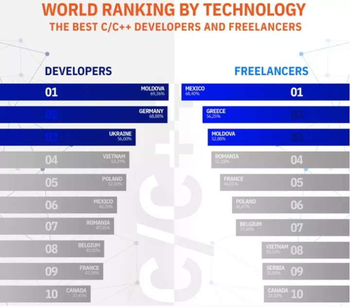 在最佳 C/C++程序员排名中,摩尔多瓦、德国、乌克兰、越南和波兰名列前茅。也有墨西哥、希腊、摩尔多瓦、罗马尼亚和法国的自由职业者擅长此语言。