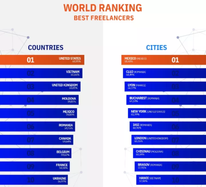排名前十的国家分别是美国、越南、英国、摩尔多瓦、墨西哥、罗马尼亚、加拿大、比利时、法国、乌克兰。而墨西哥城、克卢日和里昂是拥有最佳自由职业者的前三名城市。