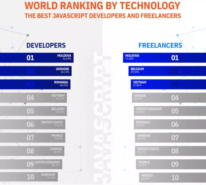 根据调研,优秀的JavaScript程序员在摩尔多瓦、乌克兰、罗马尼亚、越南和比利时。加拿大和英国的自由职业者也是一个完美的选择。