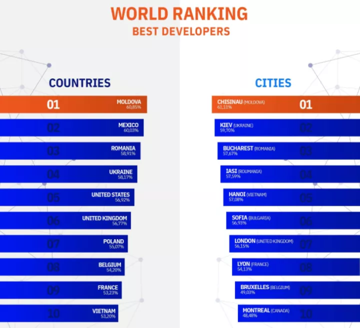 有意思的是摩尔多瓦、罗马尼亚、乌克兰三个位于东欧的国家超过了美国,名列前五。东欧国家的程序员在创新技术、便利的时区、发达的商业环境和较低的费率方面,引得了全球企业的青睐。