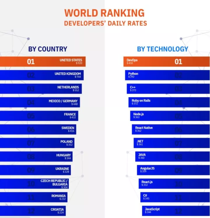 全球有2700 万程序员,其中近 400 万生活在美国,因为在这里可以赚取更多的薪水。美国程序员日薪最高,约为 920 美元,其次是英国、荷兰、墨西哥和德国。从编程语言来看,DevOps 开发人员的每日费用最高(约 410 美元),其次是 Python、C++、Ruby、Node.js。