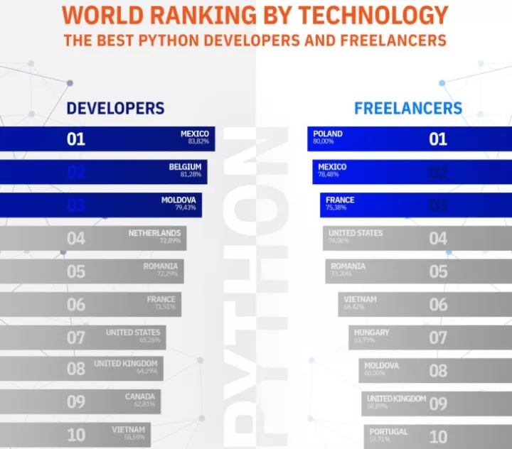 最好的 Python 程序员居住在墨西哥、比利时、摩尔多瓦、荷兰和罗马尼亚。而波兰、墨西哥、法国、美国和罗马尼亚拥有最好的 Python 自由职业者。