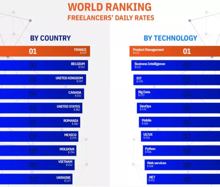 与其他国家的自由职业者相比,法国的自由职业者日薪是最对的,大约560美元,而排名第十位的乌克兰程序员,他们对一天的工作收取大约 117 美元的费用,前者是后者的5倍。
