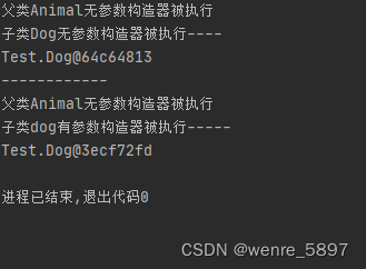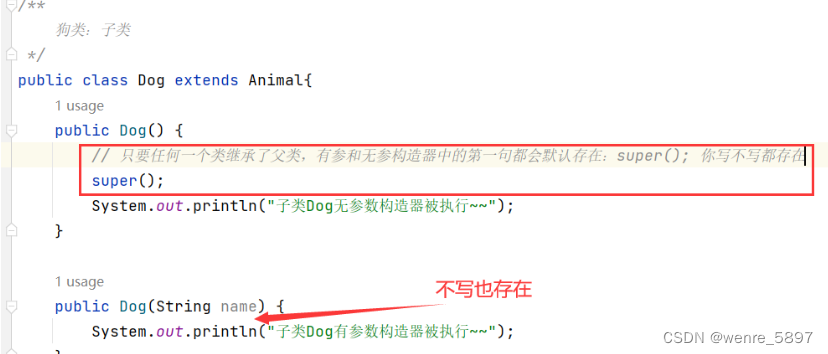 public class Dog extends Animal{public Dog(){System.out.println("子类Dog无参数构造器被执行----");}public Dog(String name){System.out.println("子类dog有参数构造器被执行-----");}