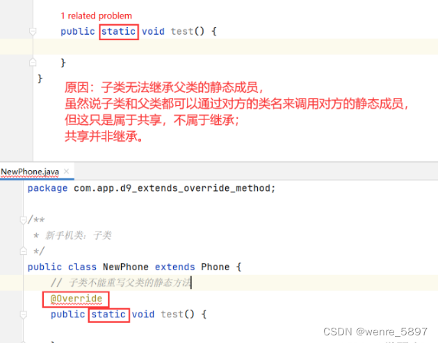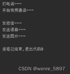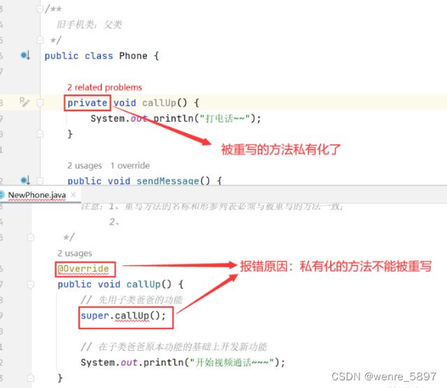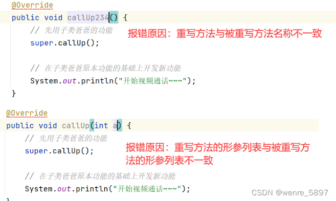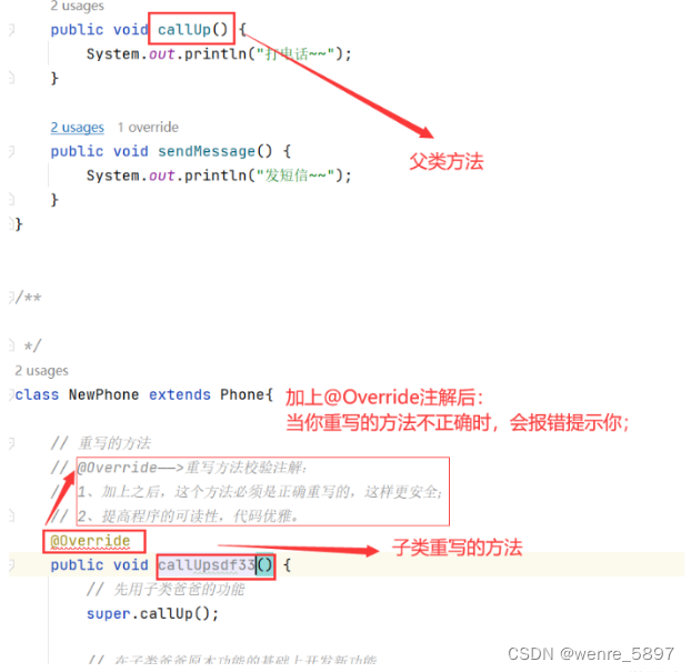 class NewPhone extends Phone{//重写的方法public void callUp(){super.callUp();//在子类爸爸原本的功能的基础上开发新功能System.out.println("开始视频通话~~~");}//重写的方法public void sendMessage(){//先用子类爸爸的功能super.sendMessage();//在子类爸爸原本功能的基础上开发新功能System.out.println("发送语音~~~");System.out.println("发送图片~~~");}