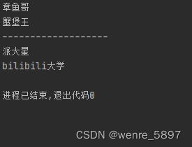 public class ThisTest {public static void main(String[] args) {ThisStudent ts1 = new ThisStudent("章鱼哥", "蟹堡王");System.out.println(ts1.getName());System.out.println(ts1.getSchoolName());System.out.println("-------------------");//实例2.如果学生不填写学校名称,默认这个学生填写的学校是:bilibili培训中心ThisStudent ts2 = new ThisStudent("派大星");System.out.println(ts2.getName());System.out.println(ts2.getSchoolName());}