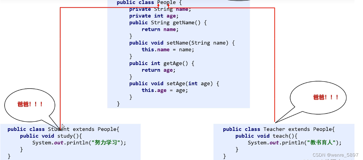 以上代码中,Student称作子类(派生类),People称为父类(基类或超类)。