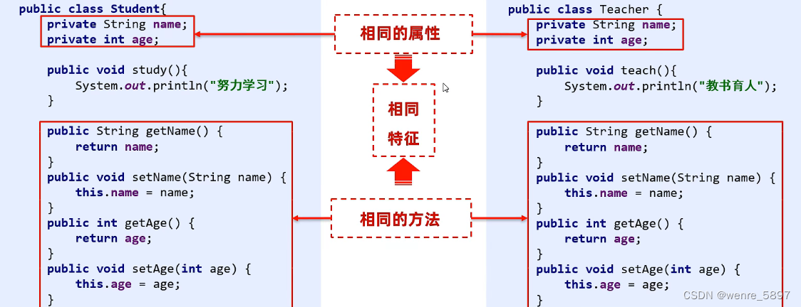 可以看到,一个是学生类,一个是老师类;他们之间都有着相同的特征:成员变量、方法;
