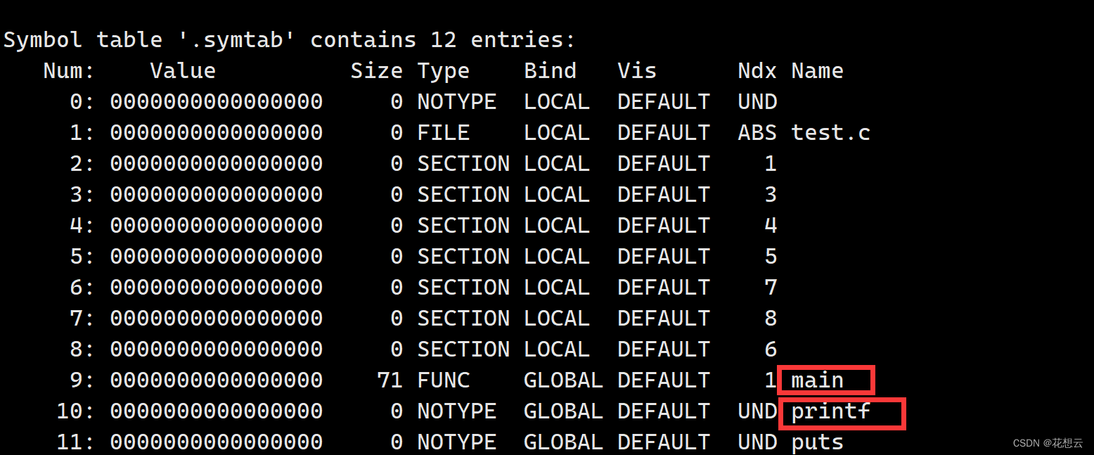 readelf -s 阅读二进制文件test.o,并显示符号表中的内容。