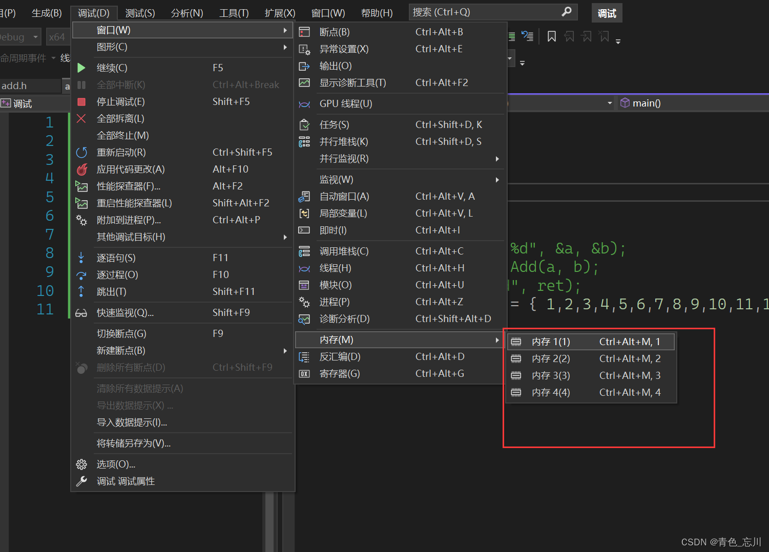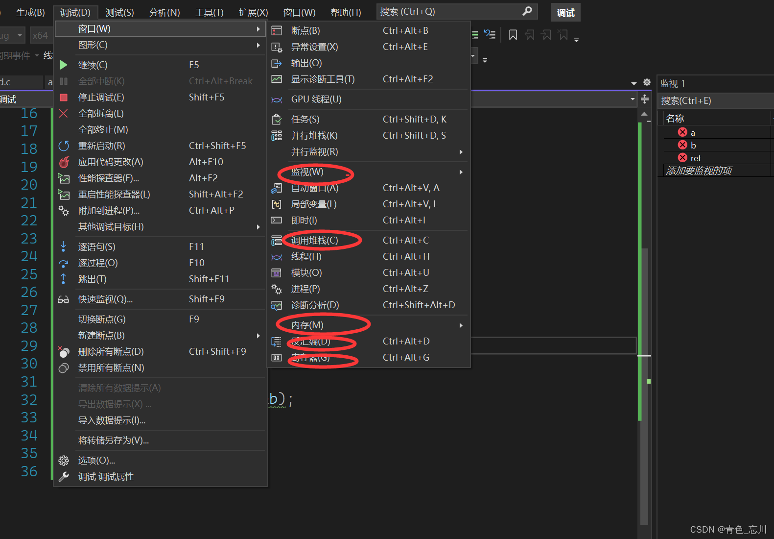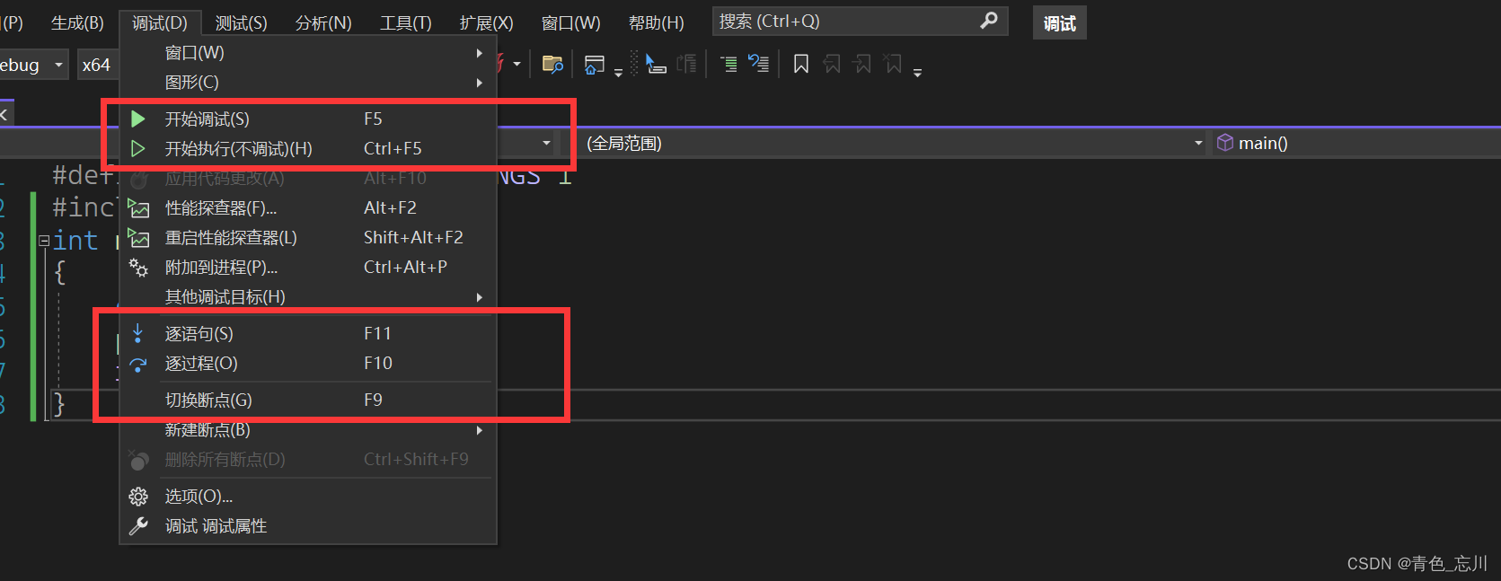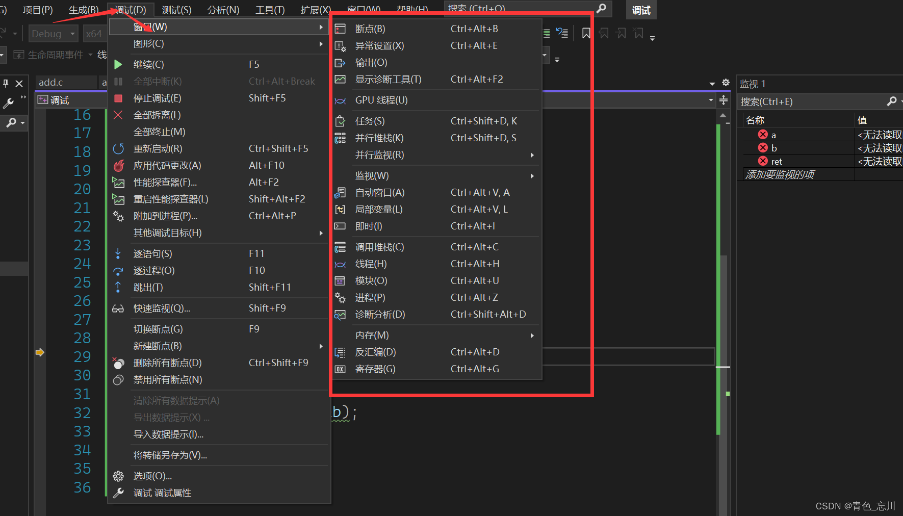 我们点击vs上面的调试,我们会发现有很多的快捷键,这些快捷键如果能够熟练使用,可以使我们的效率大幅度提高