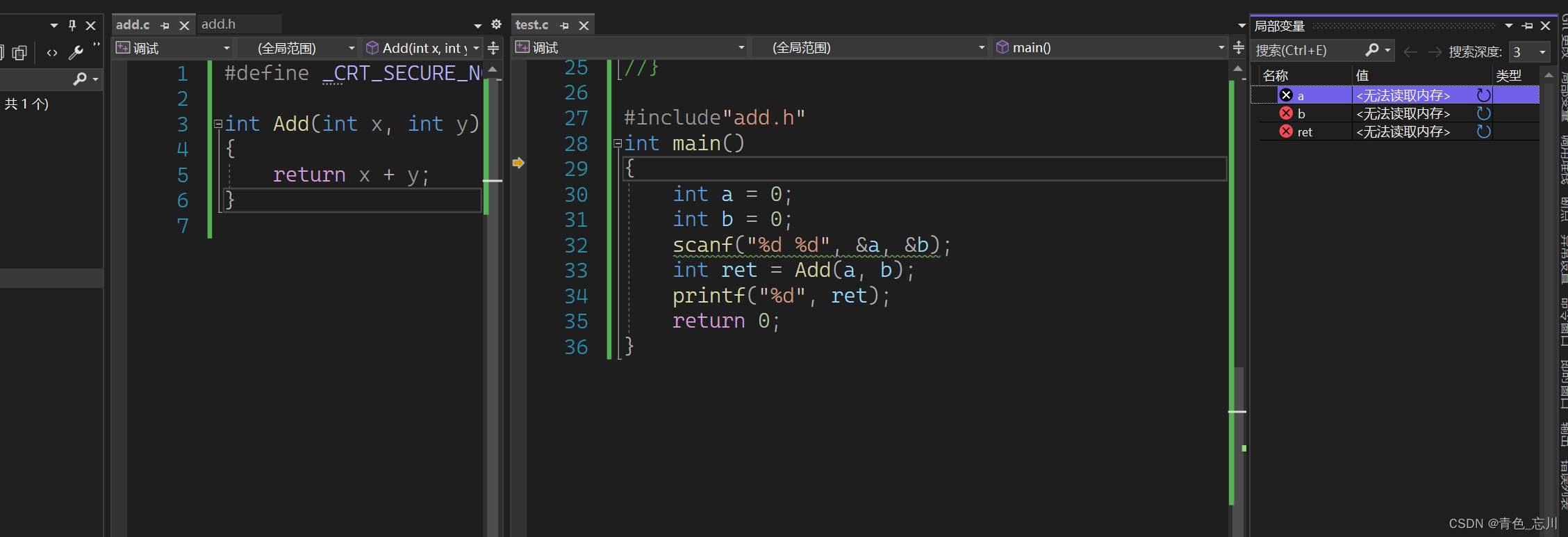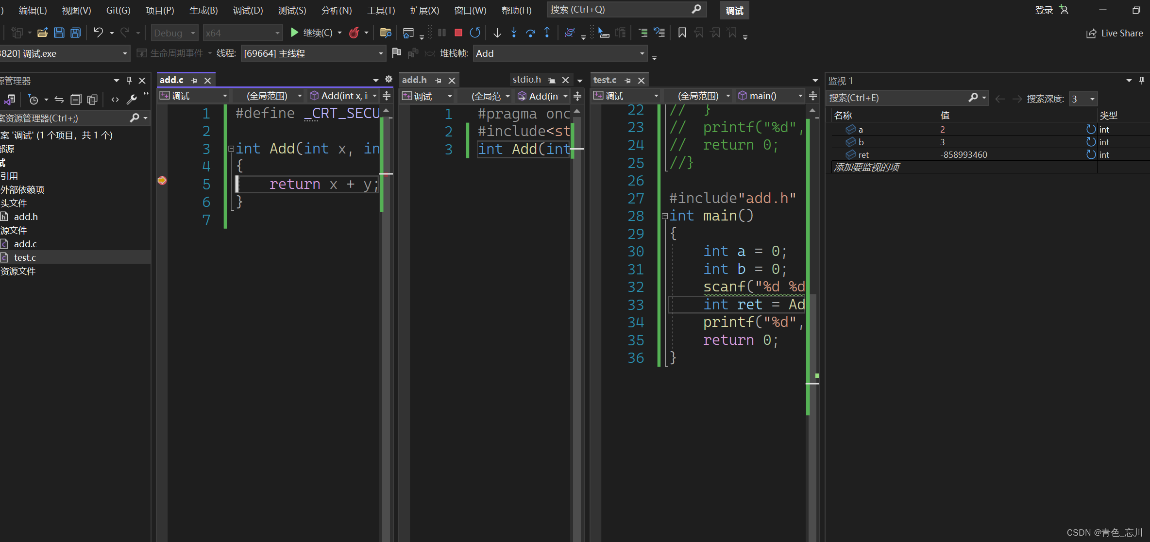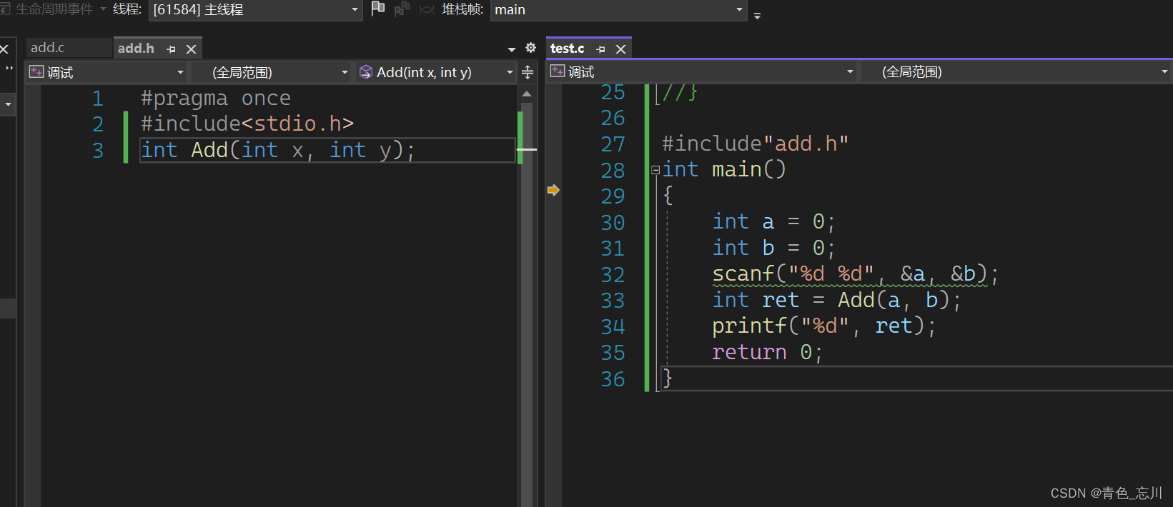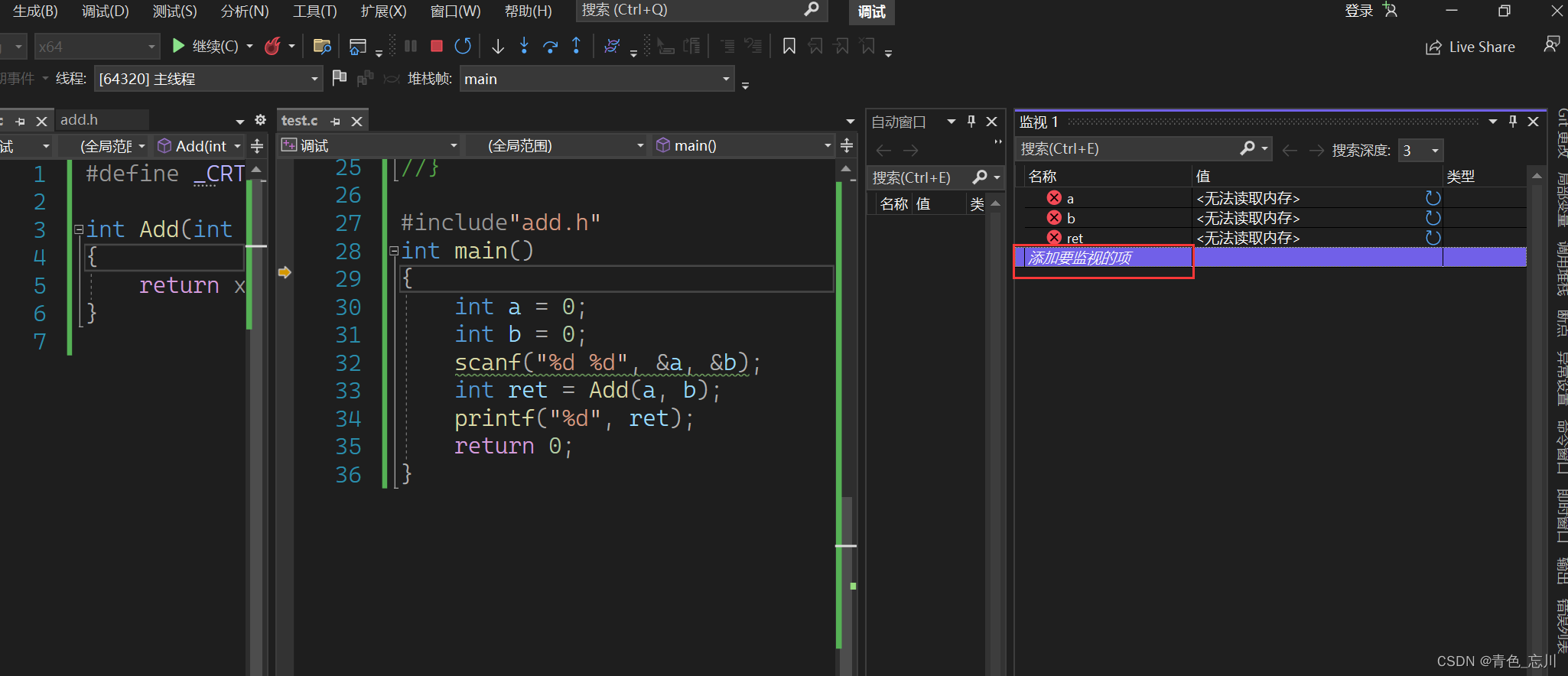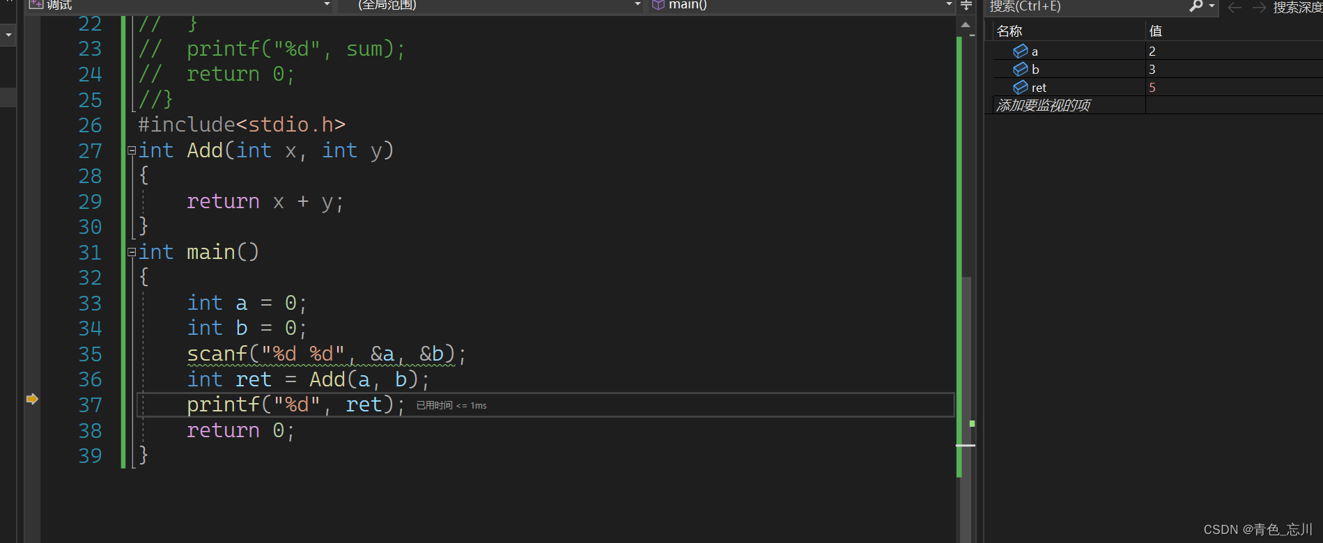 {int a = 0;int b = 0;scanf("%d %d", &a, &b);int ret = Add(a, b);printf("%d", ret);return 0;