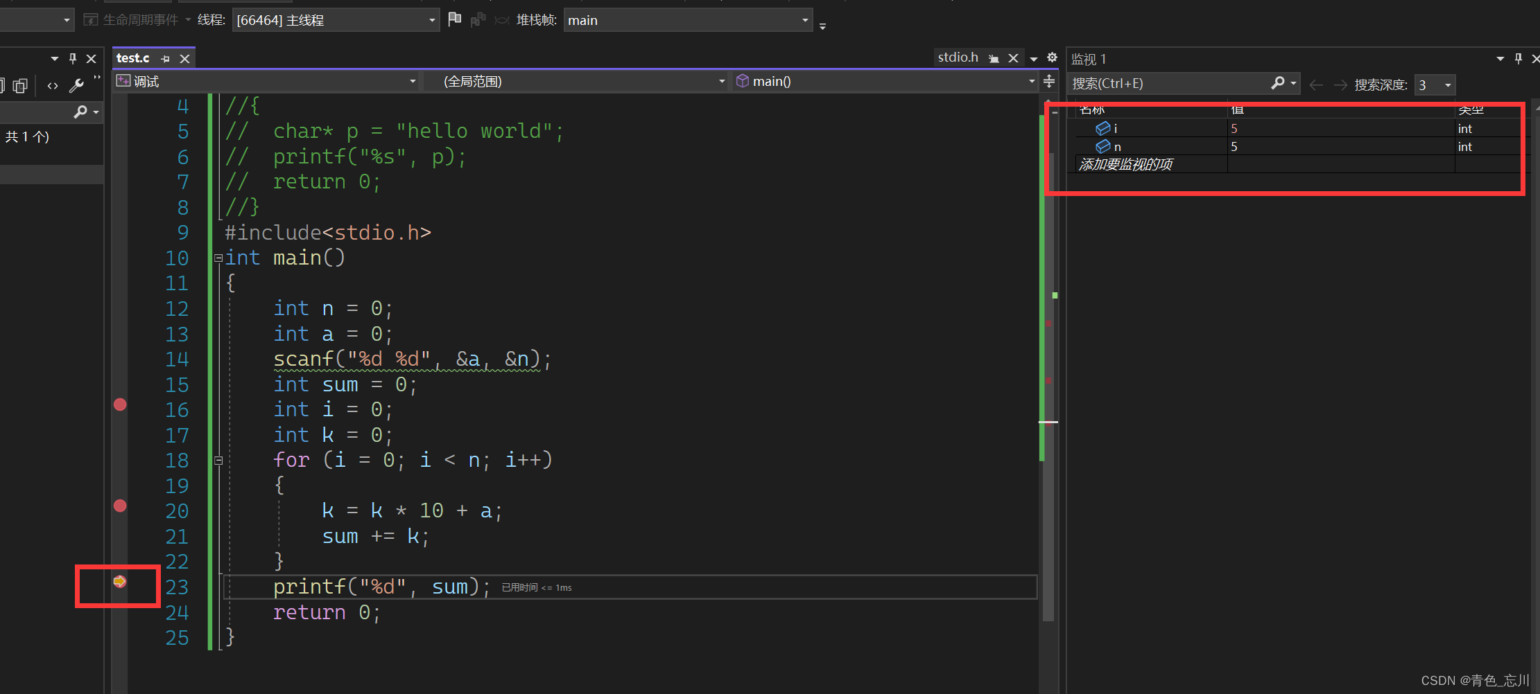 然后我们监视一下n,并使用F5,直到他离开循环,他就能进入到下一个断点处了
