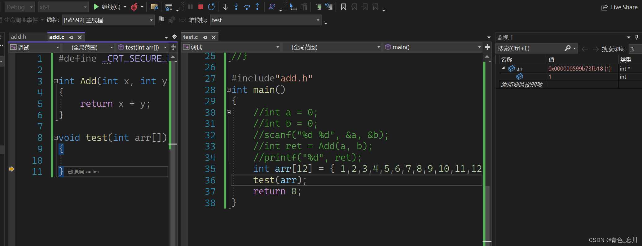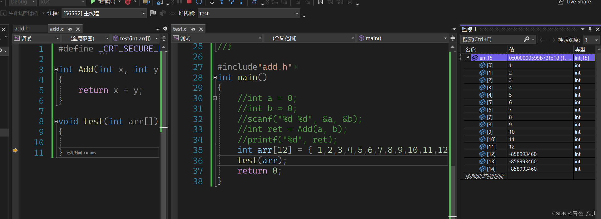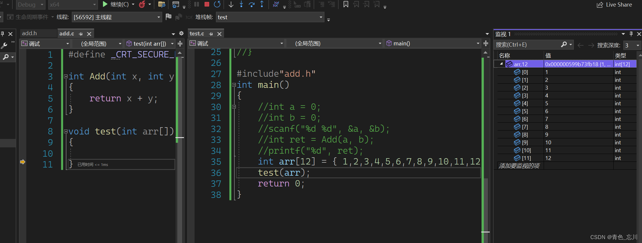 我们定义一个数组,这个数组有12个元素,然后我们将他传入一个函数中,我们进行调试