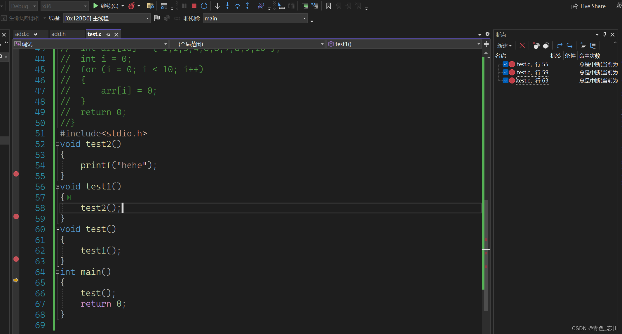 这时候我们又能联想到,如果打完断点以后在使用F10,他会进入到函数内部吗?我们尝试一下