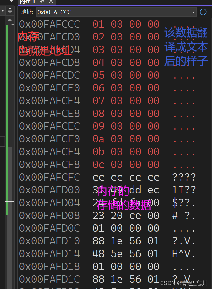 其次就是这个内存窗口一共有三列信息,从左到右依次代表着地址,地址中的数据,数据翻译成文本后的样子,而且他也只是一个参考信息。第三列其实没有多大的参考价值,我们一般只观察前两列