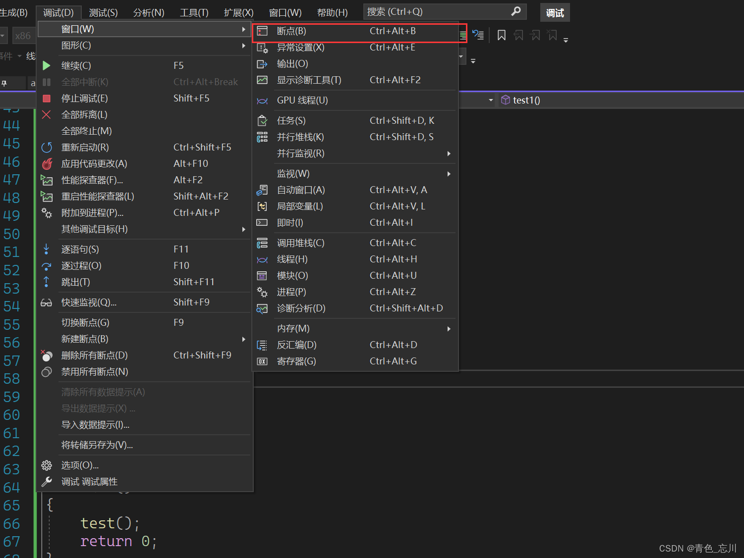 其实除了上面所说的常用的 窗口,还有一些其他的窗口也会使用,比如查看断点,我们先在程序上随便打几个断点,然后点击这个