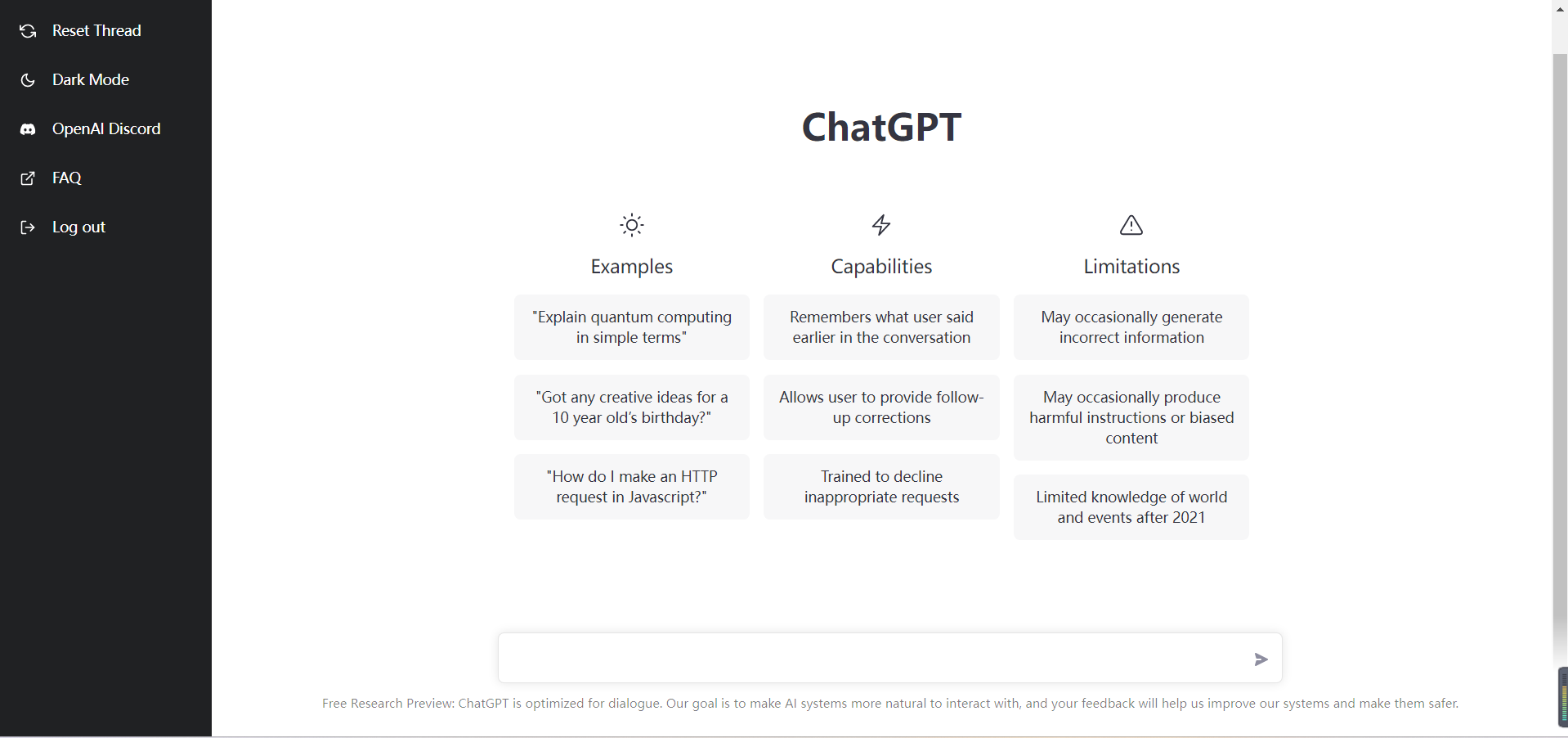 你没看错,图中的就是聊天机器人ChatGPT,千万不要小看这个简单的对话框,它的强大只有自己体验了之后才知道。