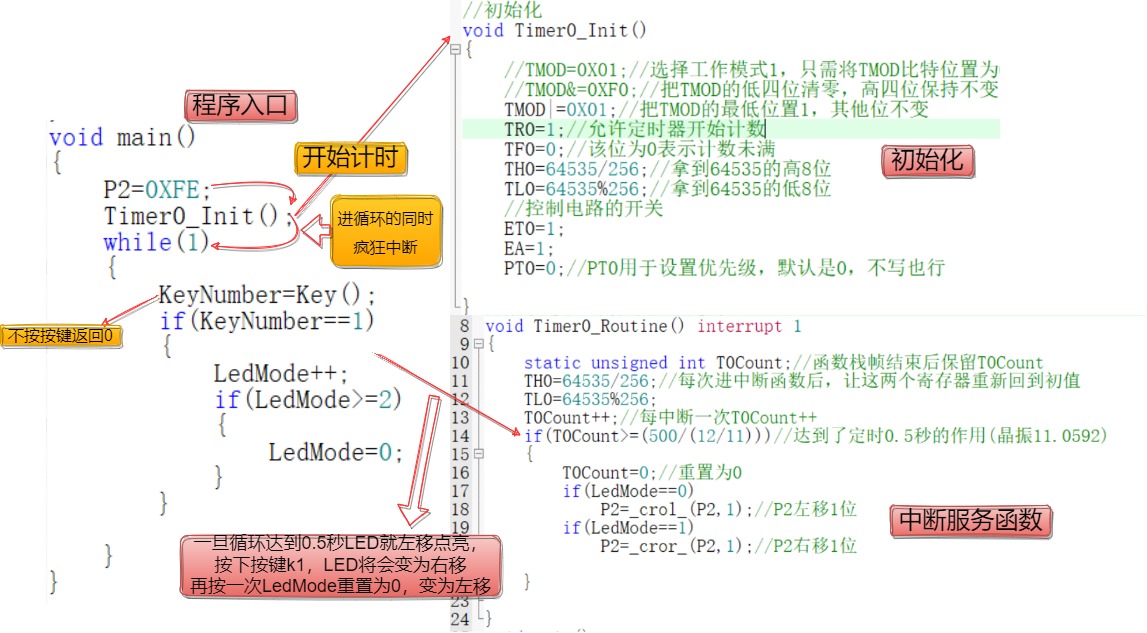 {static unsigned int T0Count;//函数栈帧结束后保留T0CountTH0=64535/256;//每次进中断函数后,让这两个寄存器重新回到初值TL0=64535%256;T0Count++;//每中断一次T0Count++if(T0Count>=(500/(12/11)))//达到了定时0.5秒的作用(晶振11.0592){T0Count=0;//重置为0if(LedMode==0)P2=_crol_(P2,1);//P2左移1位if(LedMode==1)P2=_cror_(P2,1);//P2右移1位}