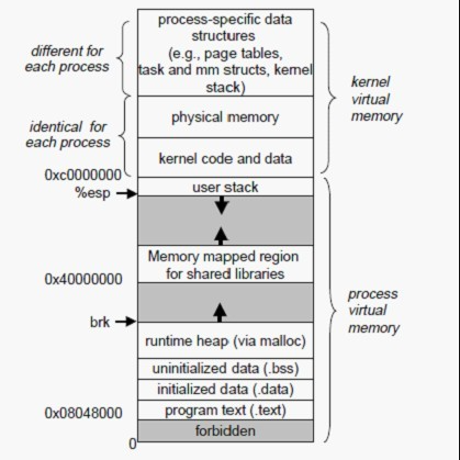 Linux中的进程虚拟存储器, 即进程的虚拟地址空间, 如果你的机子是32位,那么就有2^32=4G的虚拟地址空间,我们可以看到图中有一块区域: