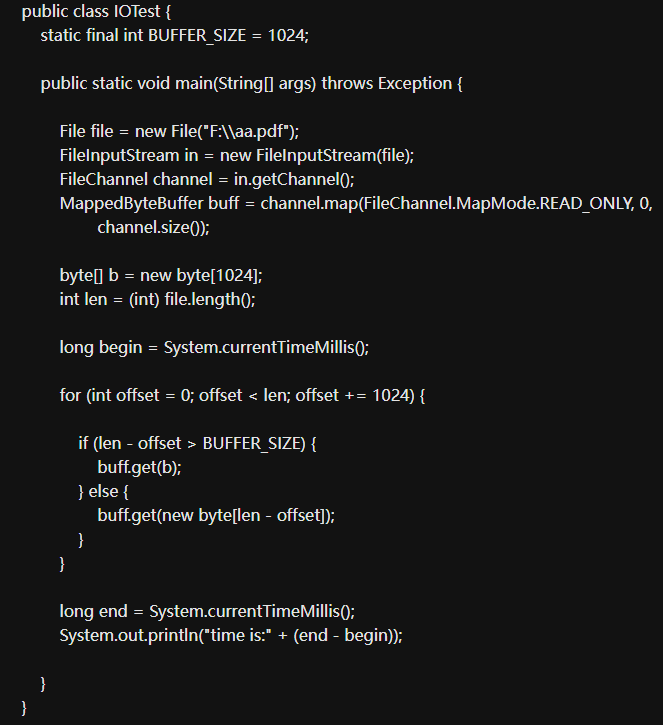 这里创建了一个只读模式的内存映射文件区域, 接下来我就来测试下与普通NIO中的通道操作相比性能上的优势,先看如下代码: