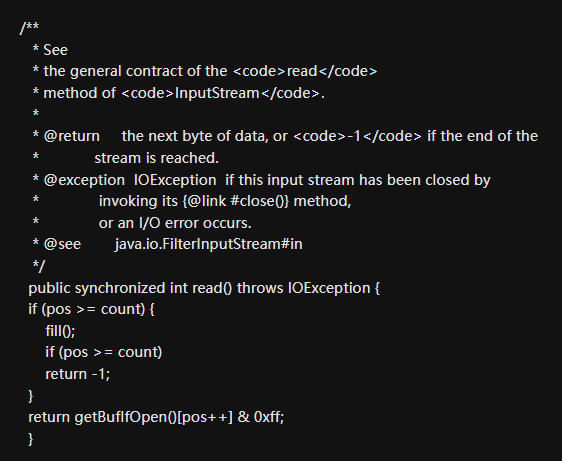 从上面的源码我们可以看到,BufferedInputStream内部维护着一个字节数组byte[] buf来实现缓冲区的功能,调用的buf的in.read()方法在返回数据之前有做一个if判断, 如果buf数组的当前索引不在有效的索引范围之内, 即if条件成立, buf字段维护的缓冲区已经不够了, 这时候会调用内部的fill()方法进行填充, 而fill()会预读更多的数据到buf数组缓冲区中去, 然后再返回当前字节数据, 如果if条件不成立便直接从buf缓冲区数组返回数据了。