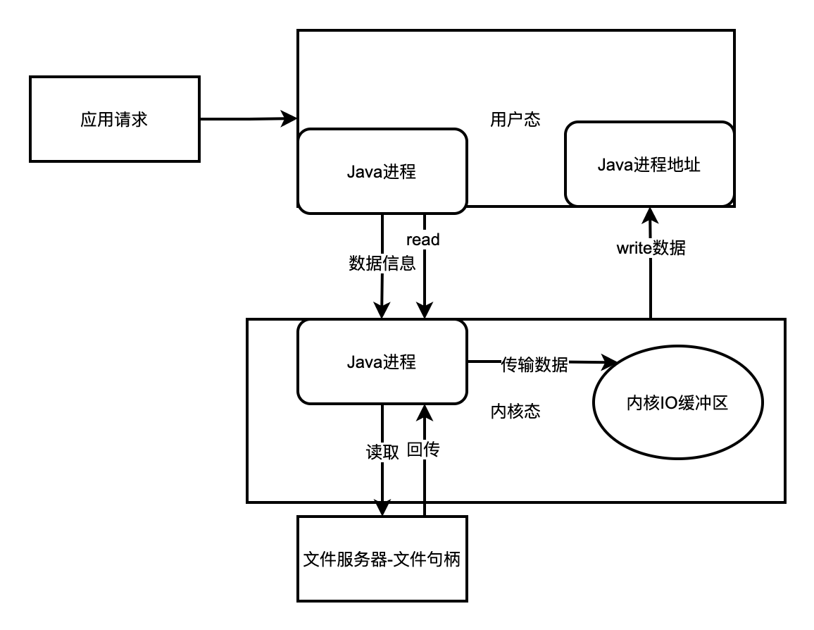 在传统的文件IO操作中, 我们都是调用操作系统提供的底层标准IO系统调用函数read()、write() , 此时调用此函数的进程(Java进程) 由当前的用户态切换到内核态, 然后OS的内核代码负责将相应的文件数据读取到内核的IO缓冲区,然后再把数据从内核IO缓冲区拷贝到进程的私有地址空间中去,这样便完成了一次IO操作,如下图所示。