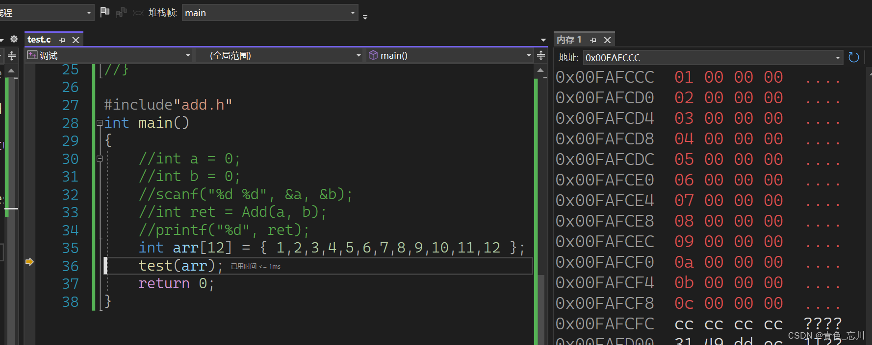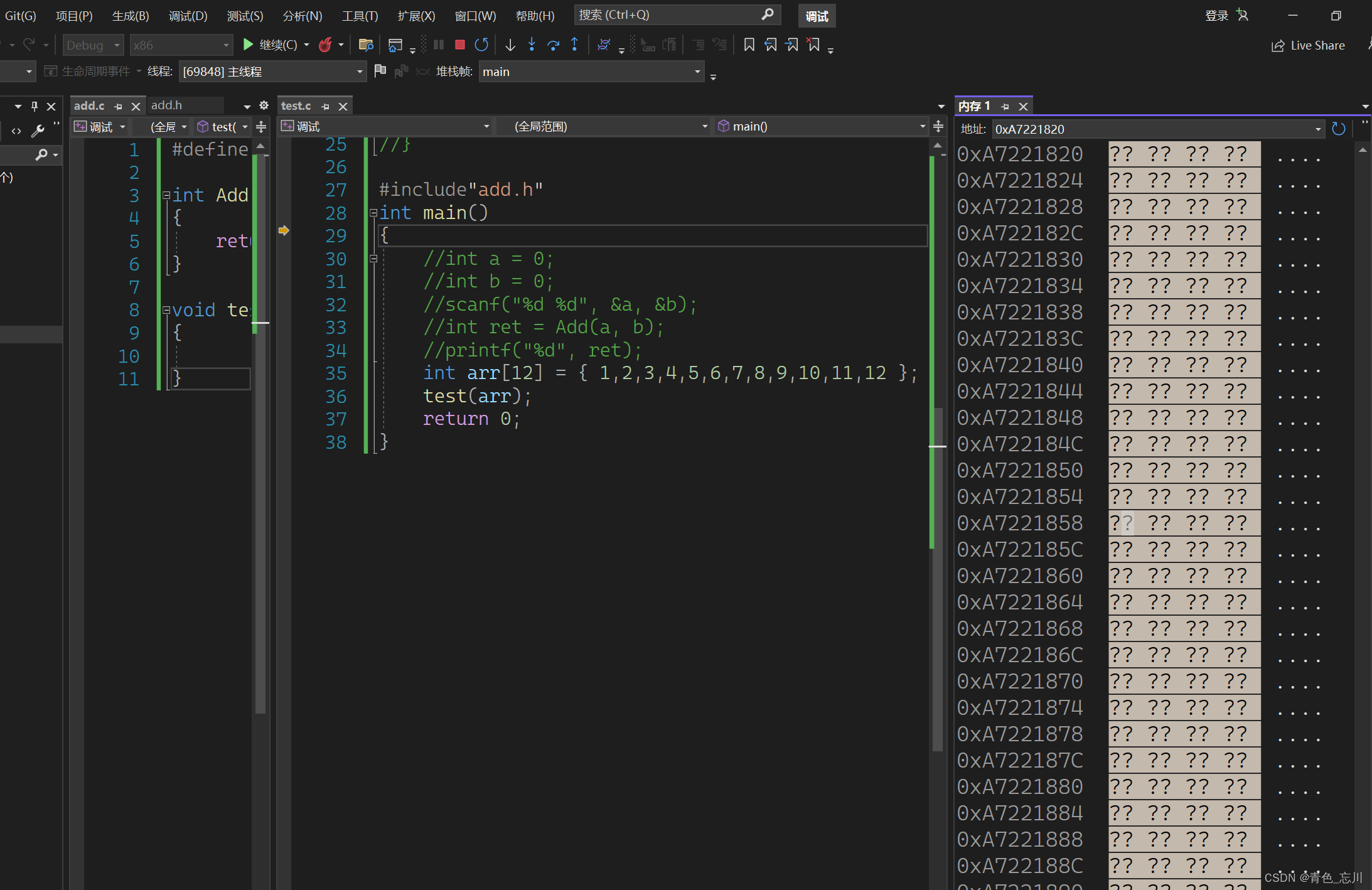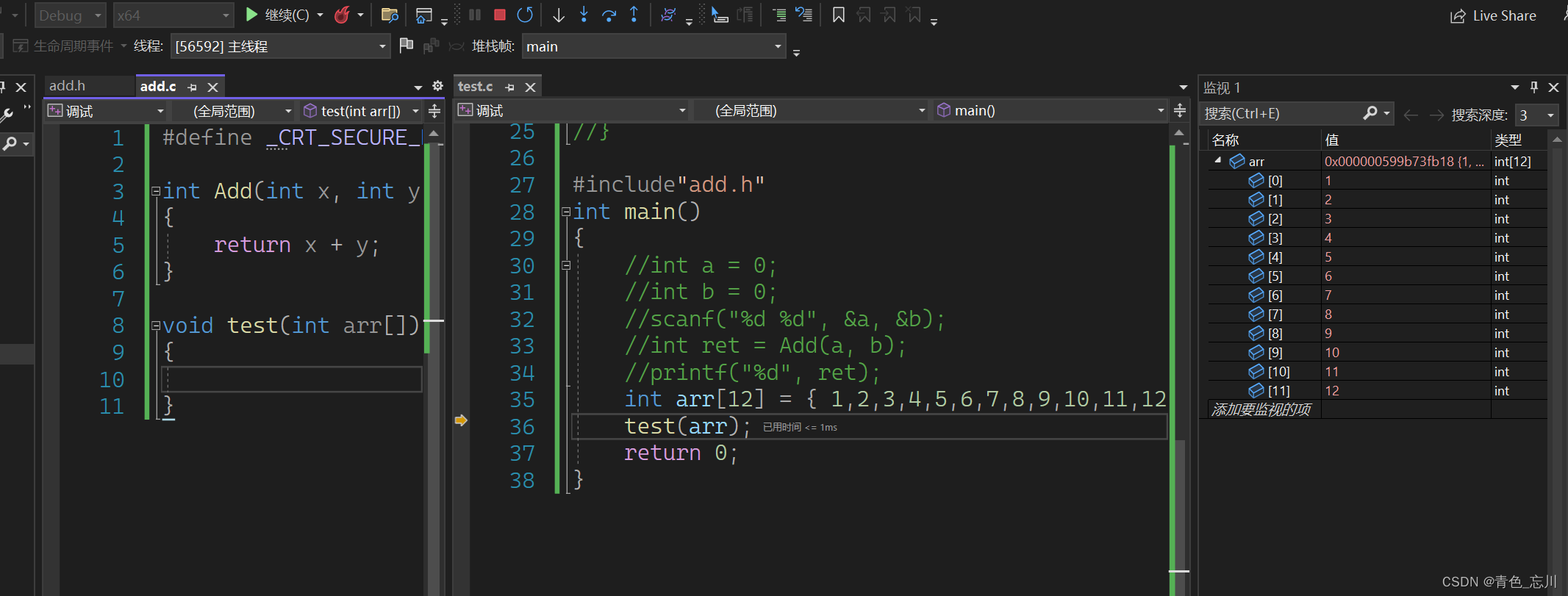 我们定义一个数组,这个数组有12个元素,然后我们将他传入一个函数中,我们进行调试