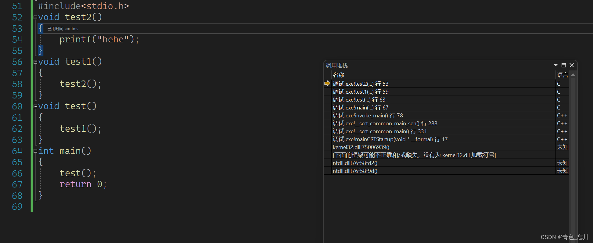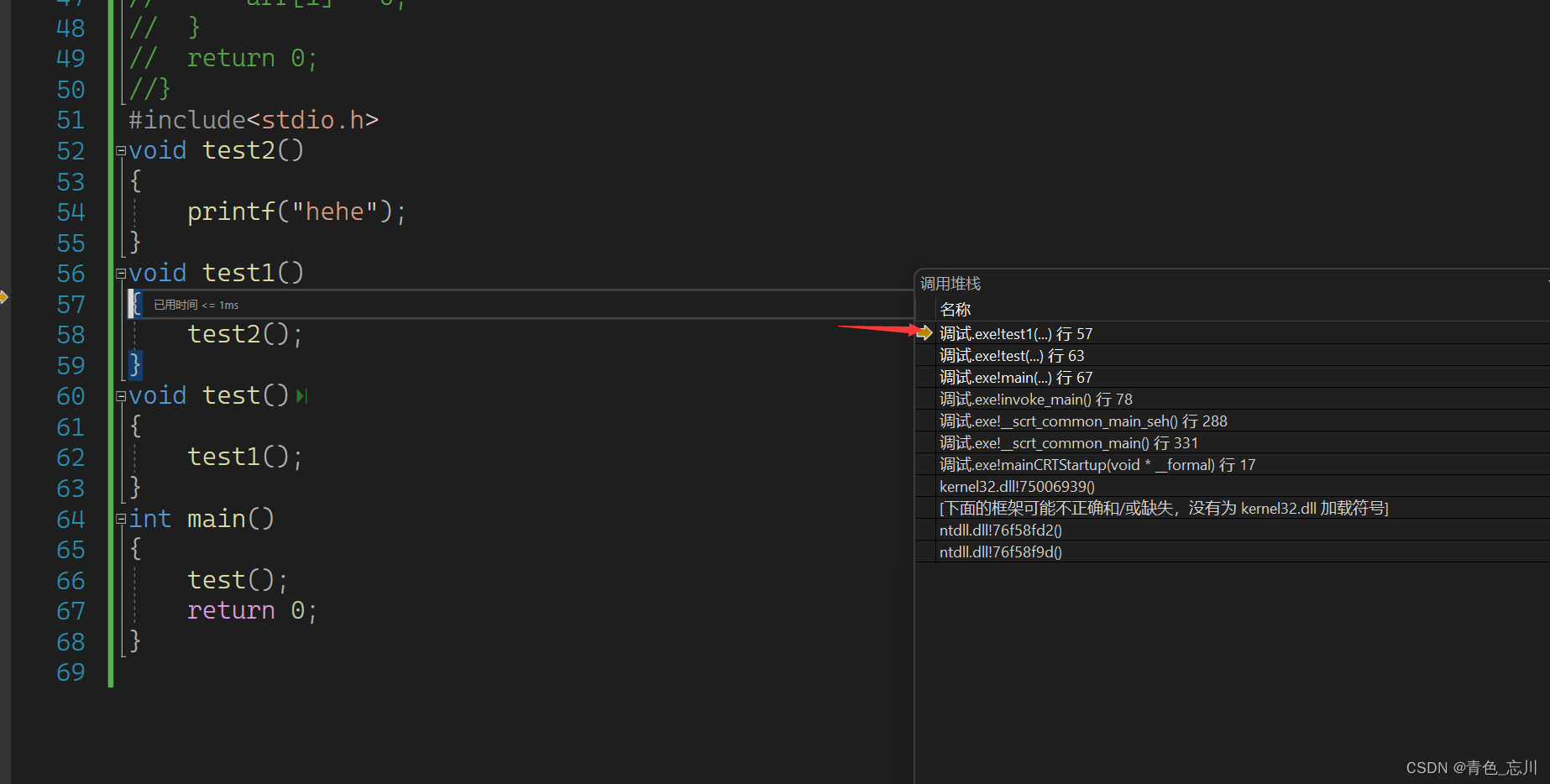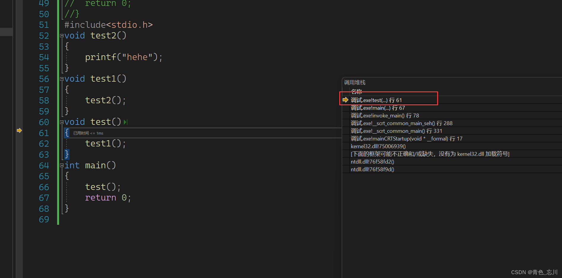 而我们直接F11让代码调试起来,就会发现调用堆栈多了一共test函数