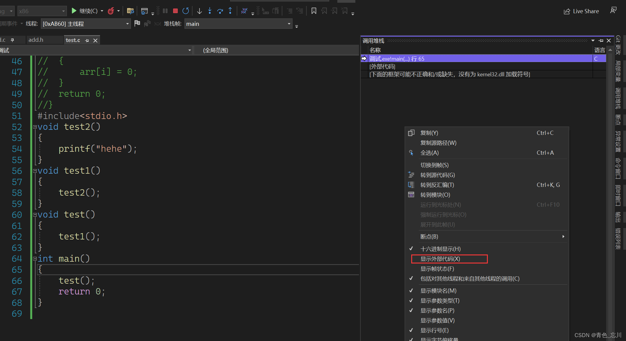 而我们刚刚选中的显示外部代码,其实就是显示main函数之前的调用关系,如果不选中的话就不会显示之前的调用关系了