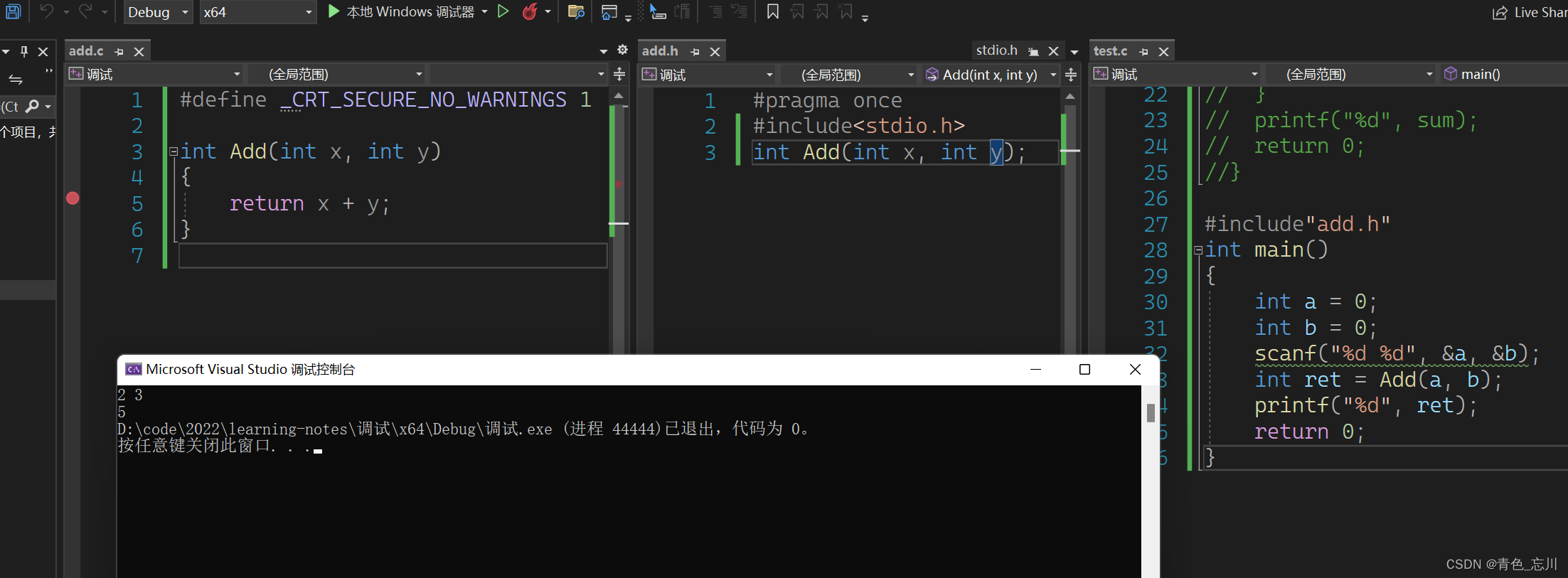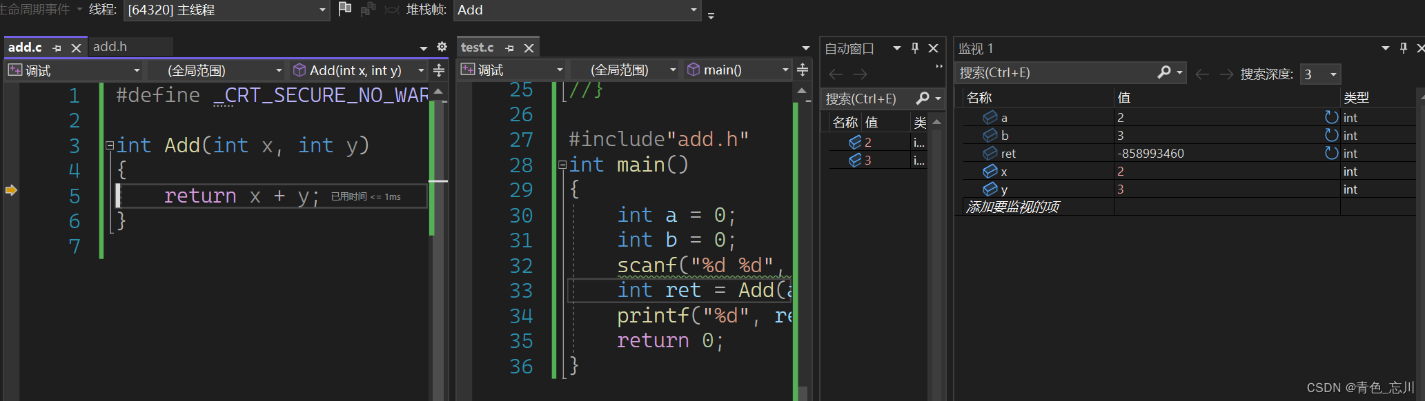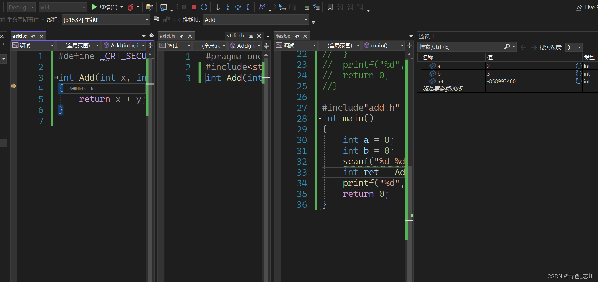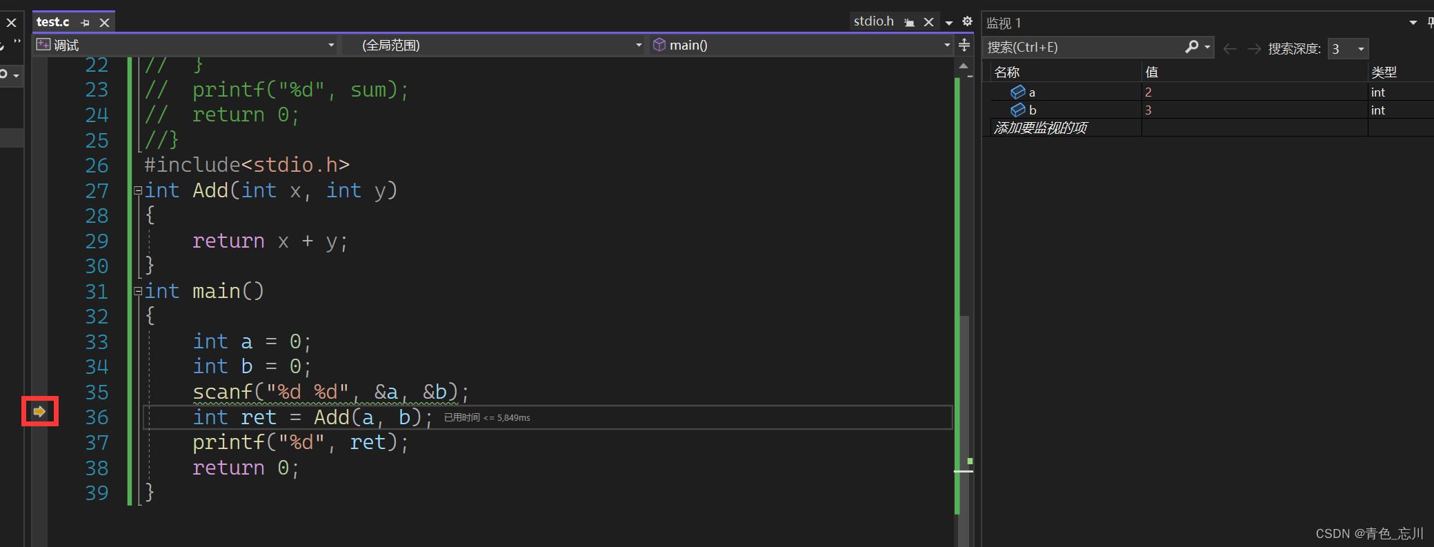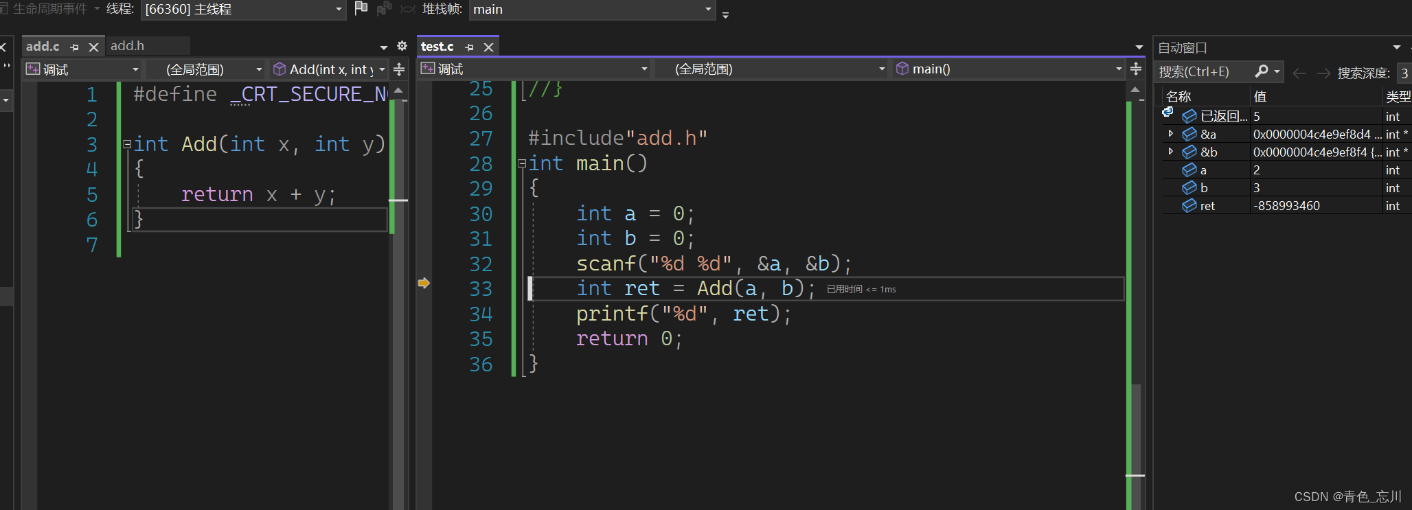 {int a = 0;int b = 0;scanf("%d %d", &a, &b);int ret = Add(a, b);printf("%d", ret);return 0;