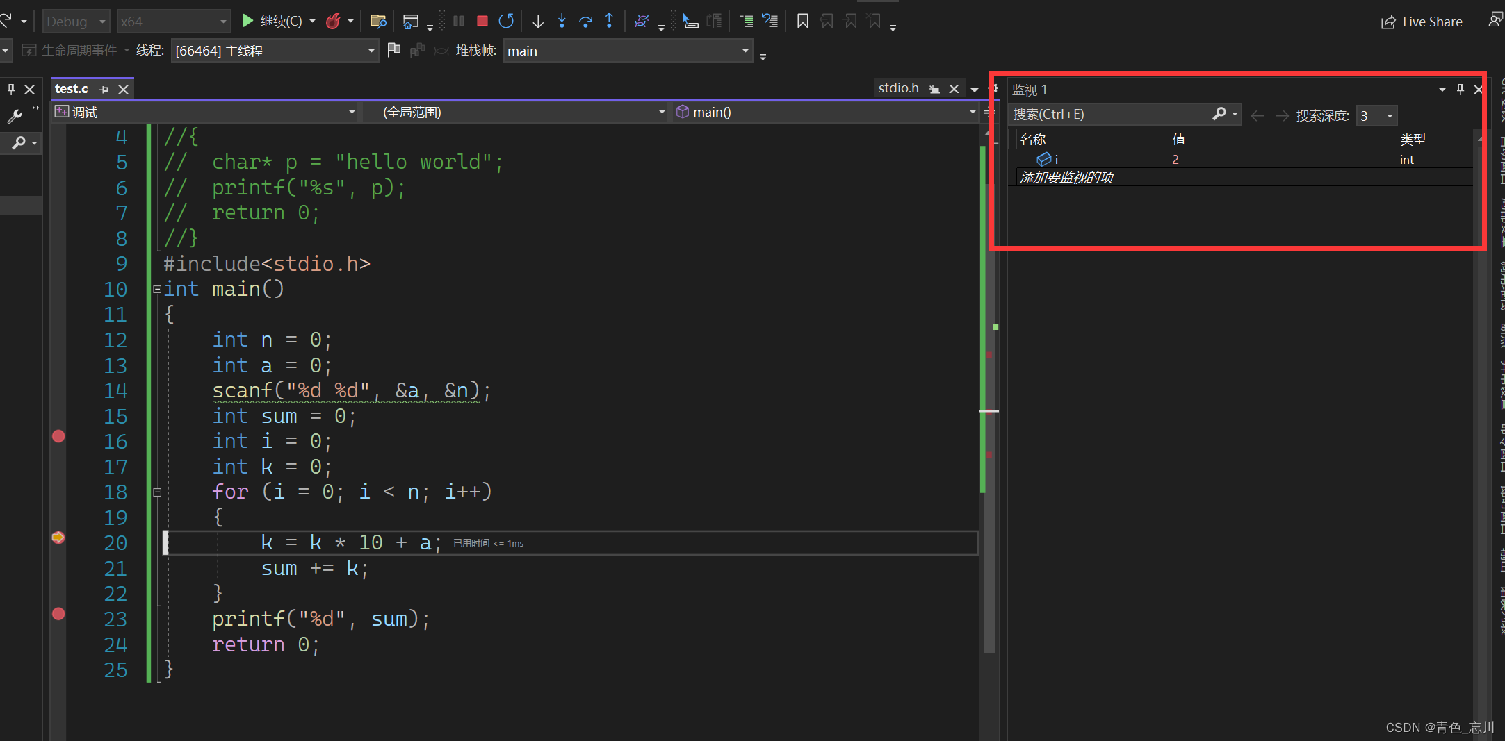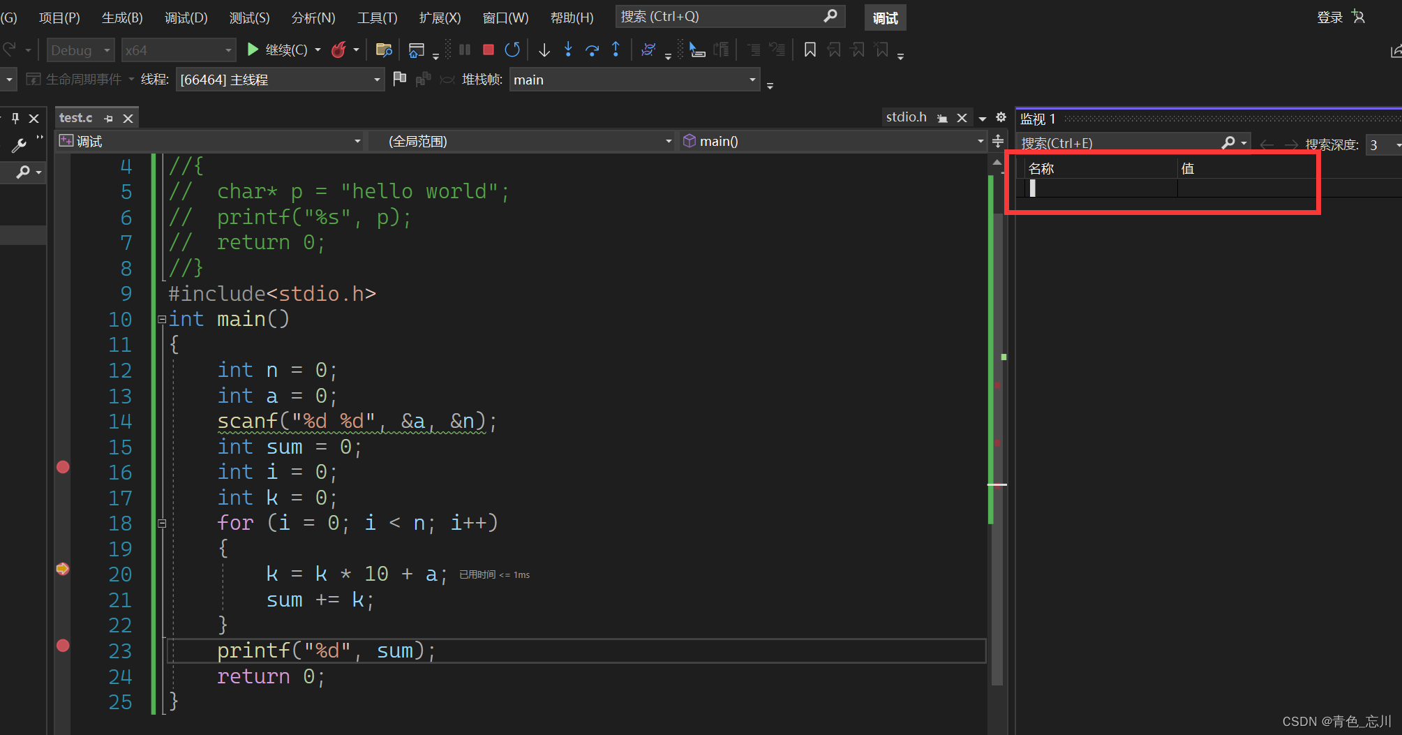 然后我们监视一下n,并使用F5,直到他离开循环,他就能进入到下一个断点处了